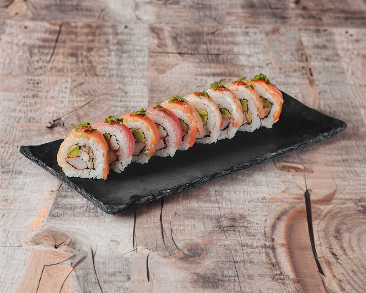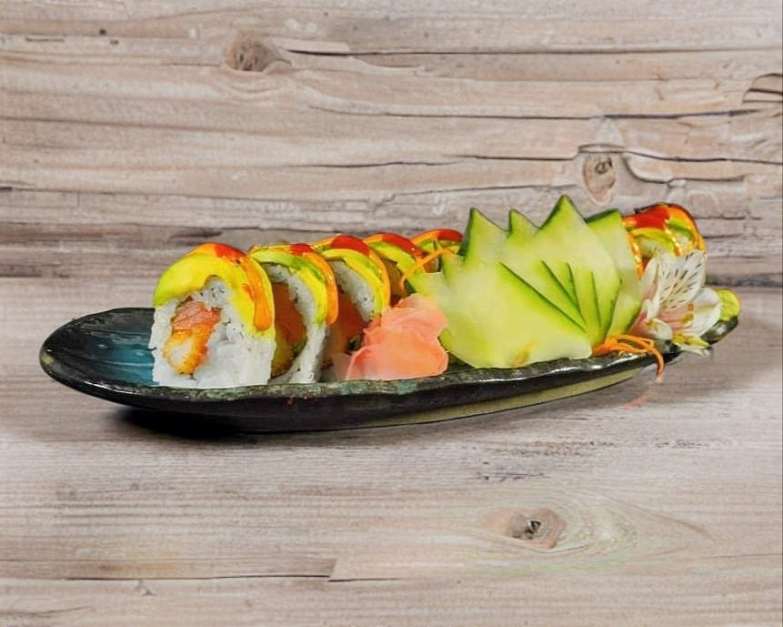 CAMARON TEMPURA , AGUACATE, CANGREJO Y PEPINO XF. TEMPURA CRUNCH , SALSA DE ANGUILA Y SALS SPICY