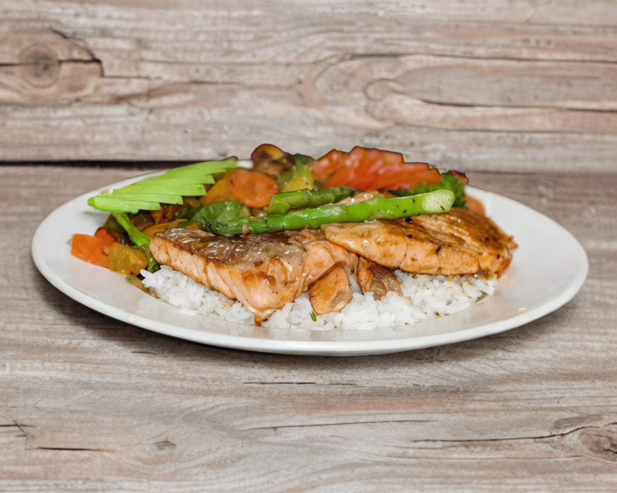 SALMON A LA PLANCHA , ARROZ Y VERDURAS MARINADOS EN SALSA DE SOYA ,.