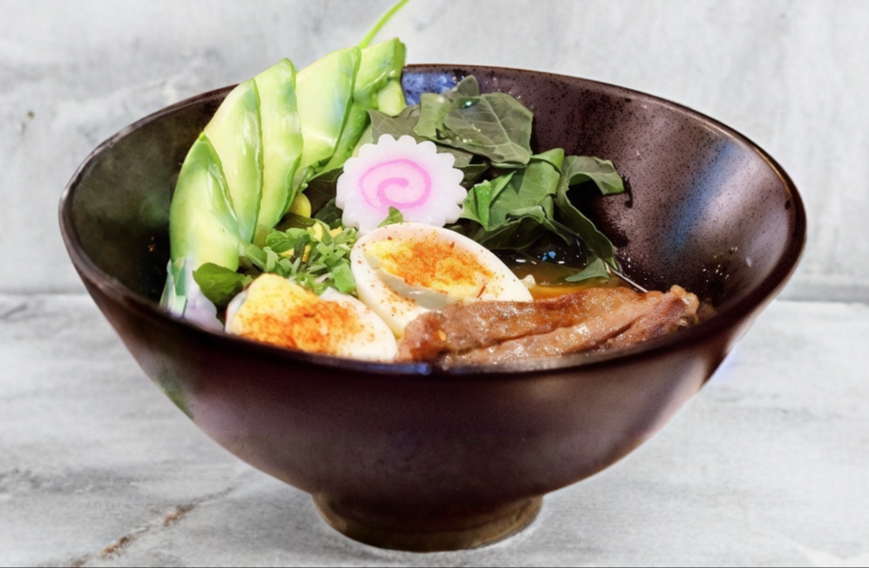 CONSOME' JAPONES , FILETE DE RES , PASTA RAMEN , HUEVO , ESPINACA , NARUTO, AGUACATE Y CEBOLLIN