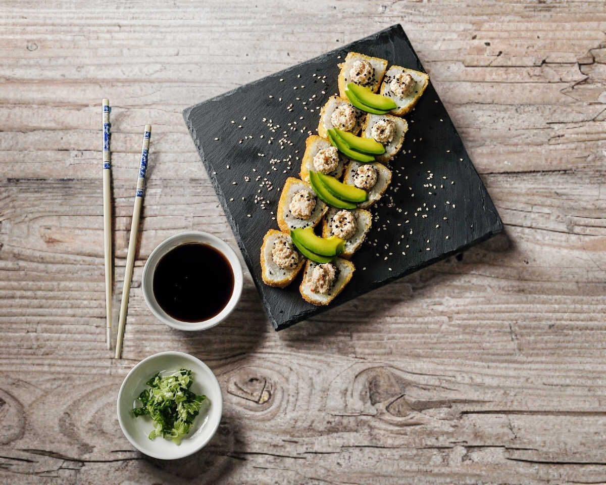 CAMARON EMPANIZADO , AGUACATE Y PEPINO XF. MANGO , SALSA SRIRACHA Y SISHIMI TOGARASHI .