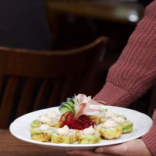 CAMARON TEMPURA, CANGREJO, AGUACATE Y QUEO CREMA .XF PLATANO FRITO , SALSA TAMPICO Y SALSA DE ANGUILA