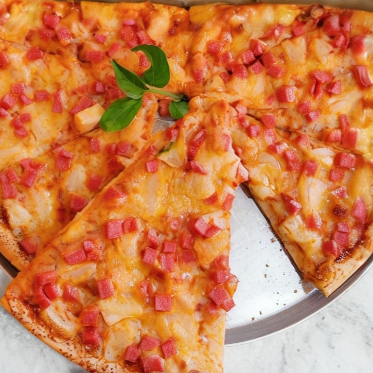 Pizza de 4 rebanadas con piña, chorizo, tocino, cebolla y queso.