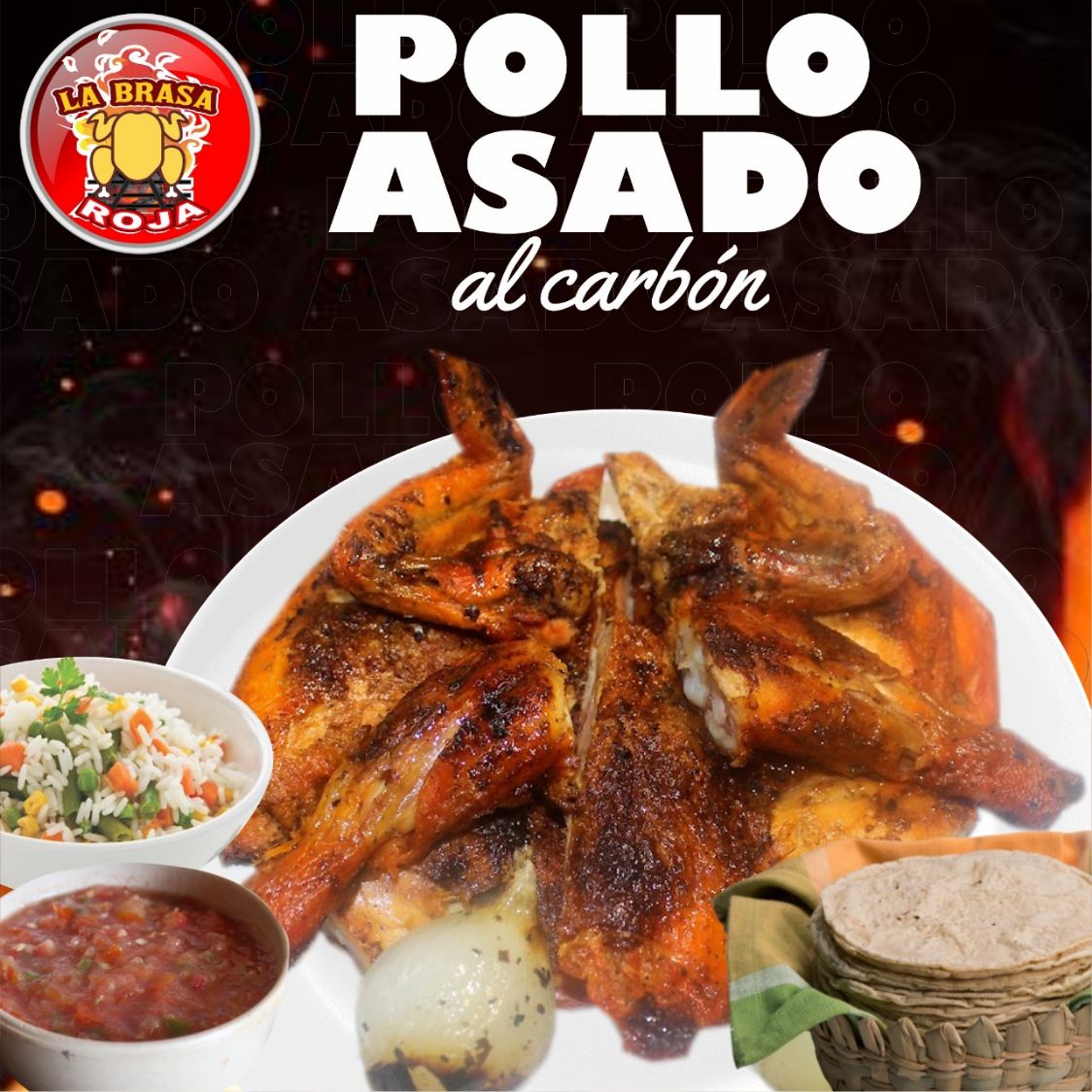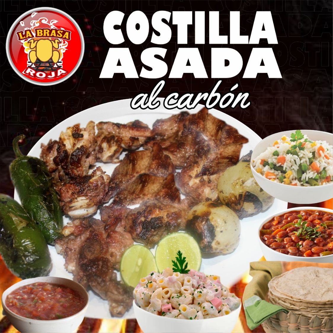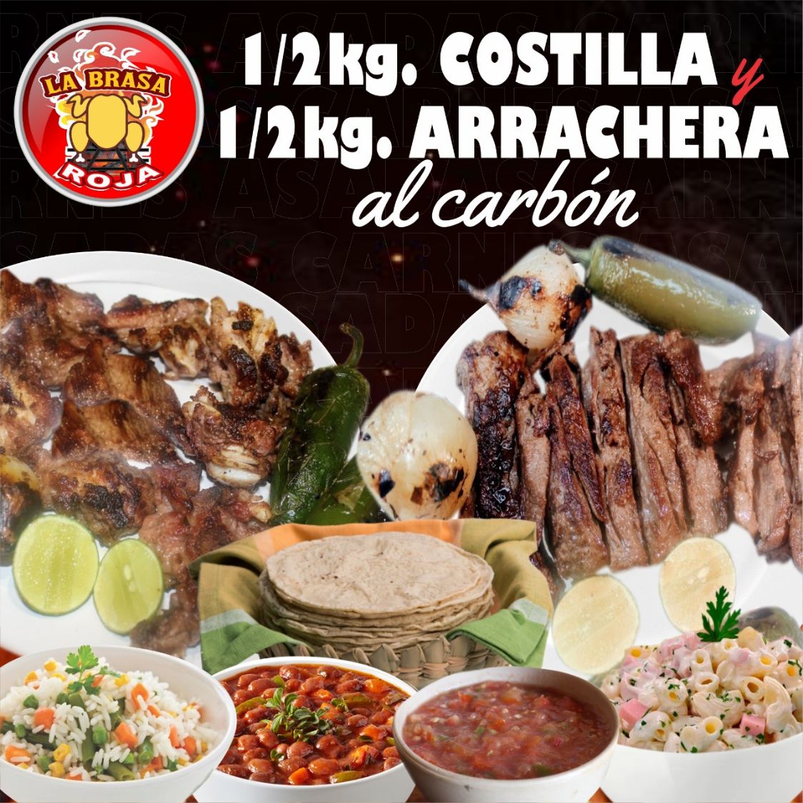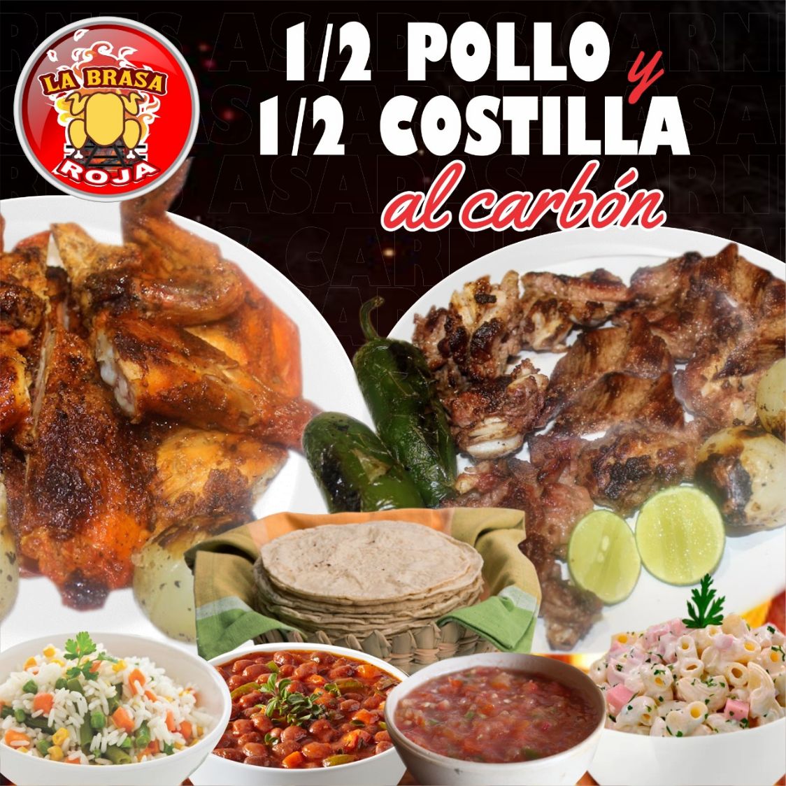 1/2 Pollo Asado..*1 + 1/2 Kg de Costilla Asada al Carbón..*1, Salsa, tortillas y cebolla asada.