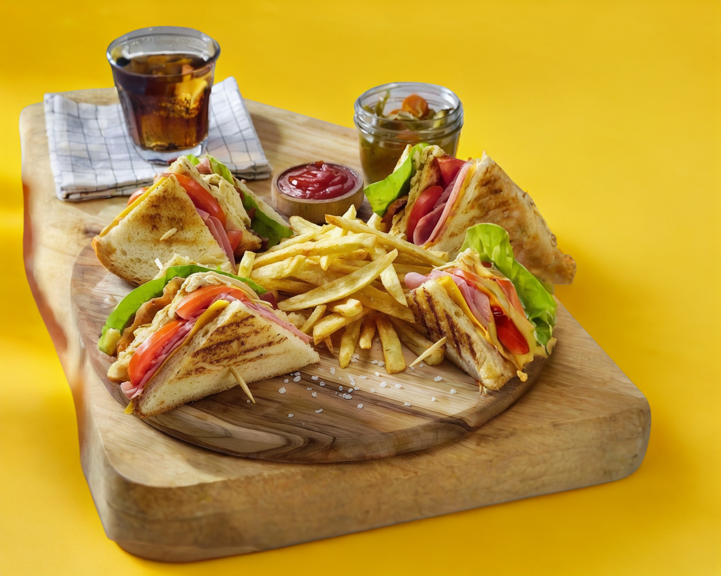 PAN DE CAJA CON CAMA DE VERDURAS, JAMON DE PAVO Y QUESILLO ACOMPAÑADO DE PAPAS FRITAS O ENSALADA