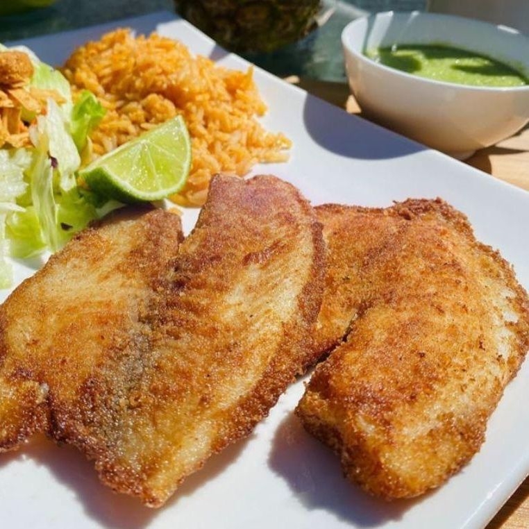 1 Filete de pescado empanizado acompañado de dos guarniciones, salsa y tortillas.