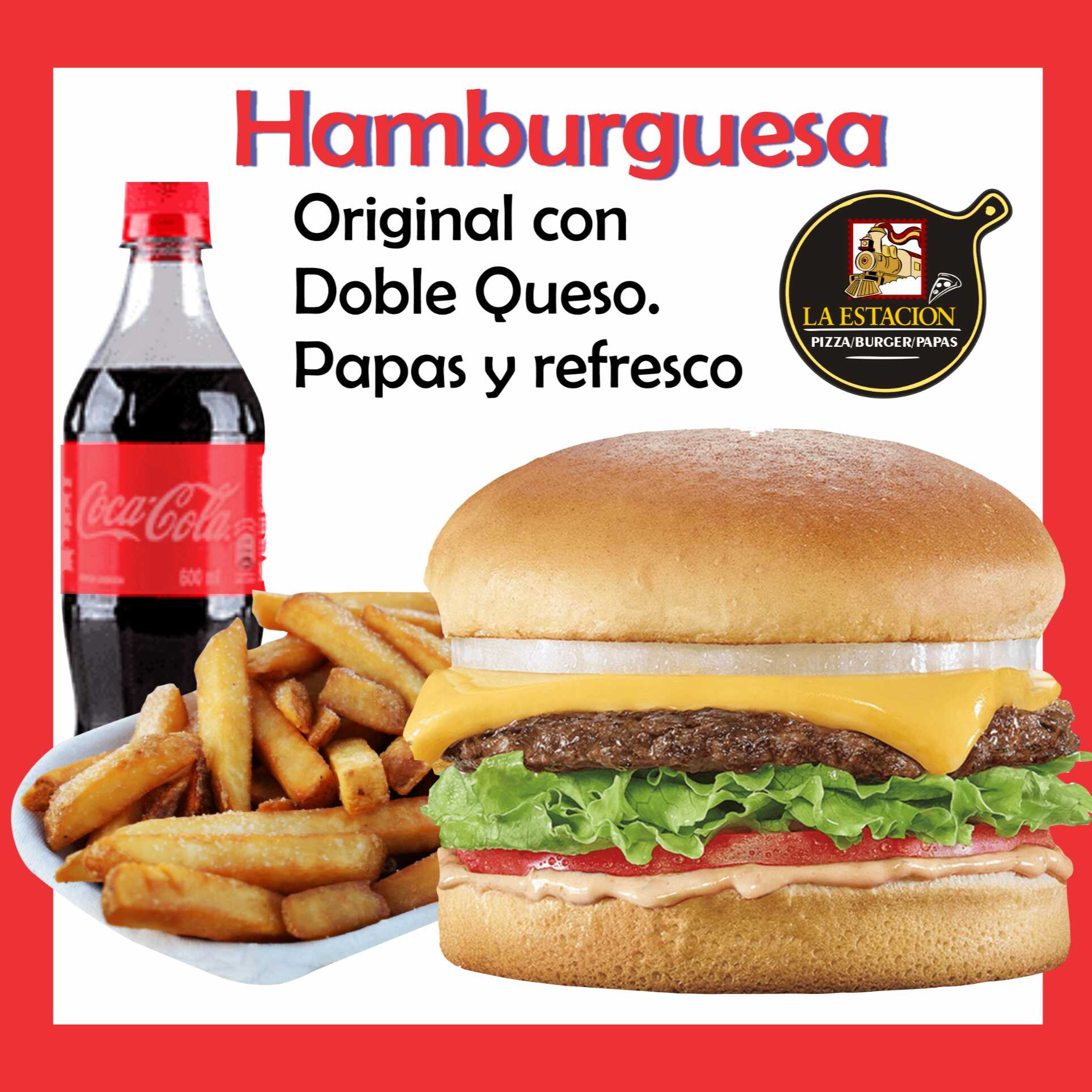 Hamburguesa Doble Carne con queso, papas, refresco
