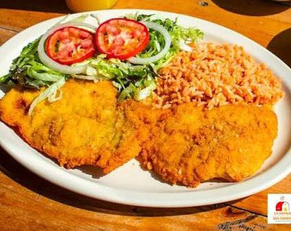 Milanesa de pollo con arroz, ensalada y pasta de frijol.