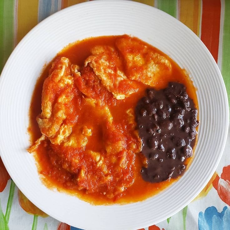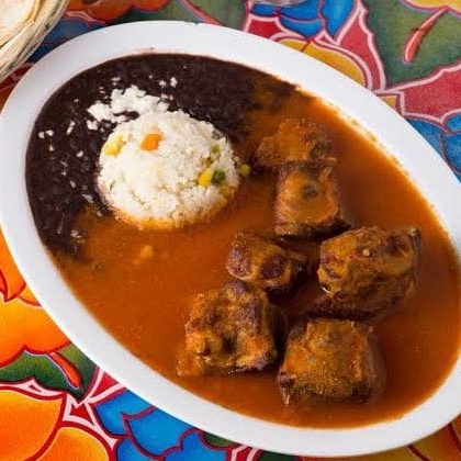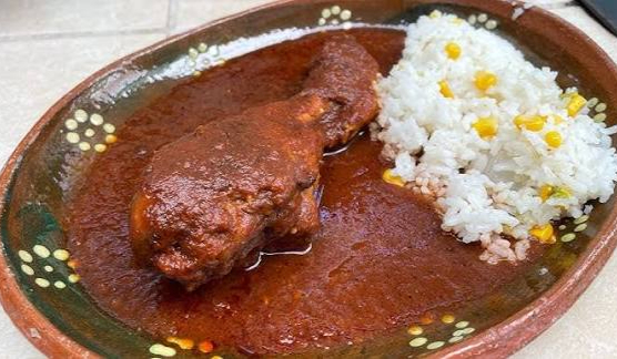 Pollo enchilado con arroz y frijol.