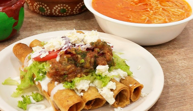 Tacos dorados de pollo o quesillo con sopa.