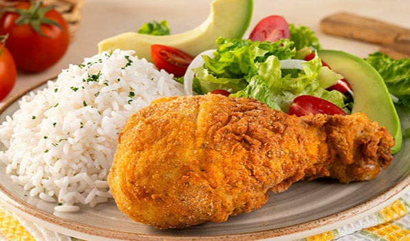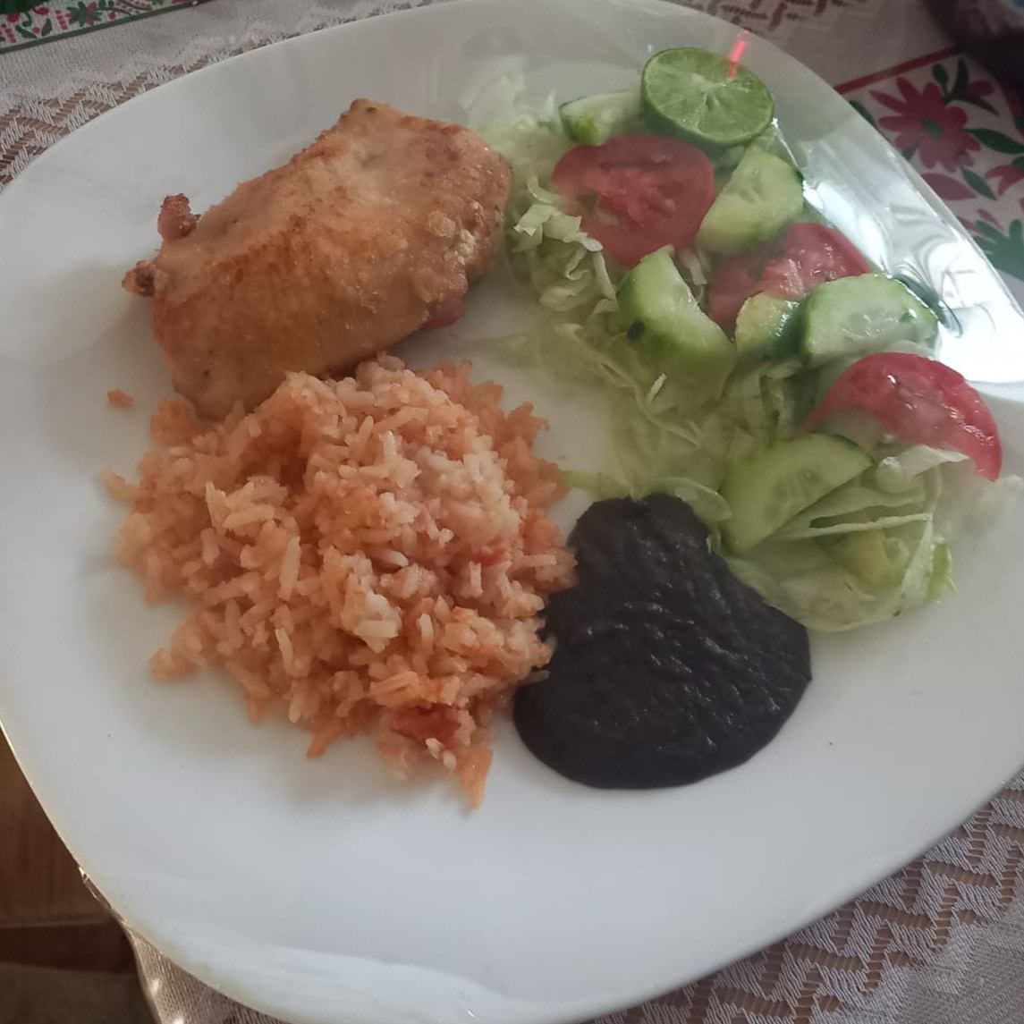 Pollo frito con arroz, ensalada y pasta de frijol.