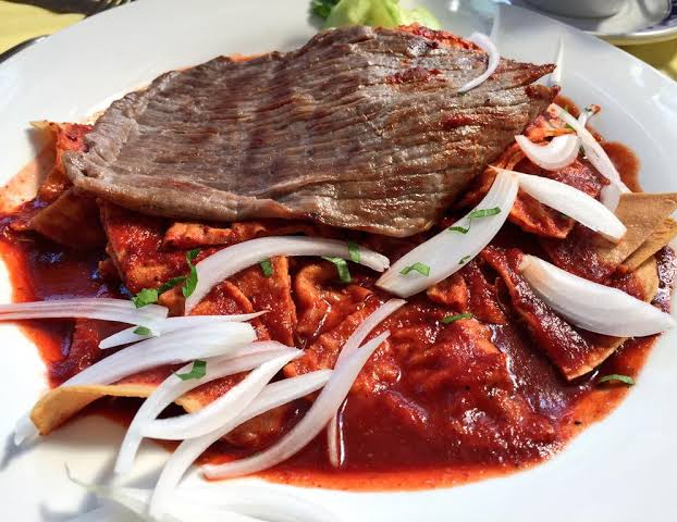 Chilaquiles rojos o verdes con tasajo, cecina y huevo.