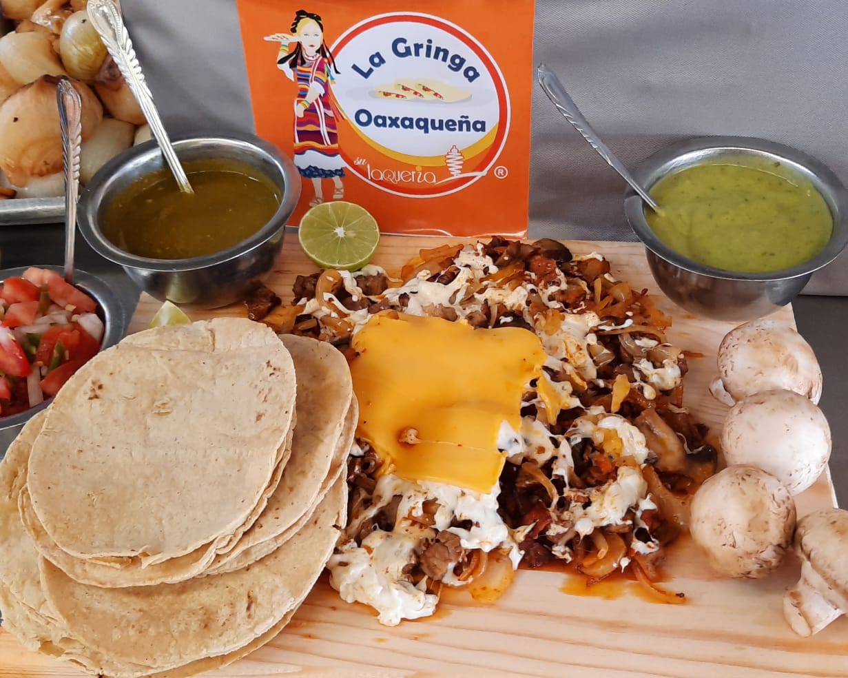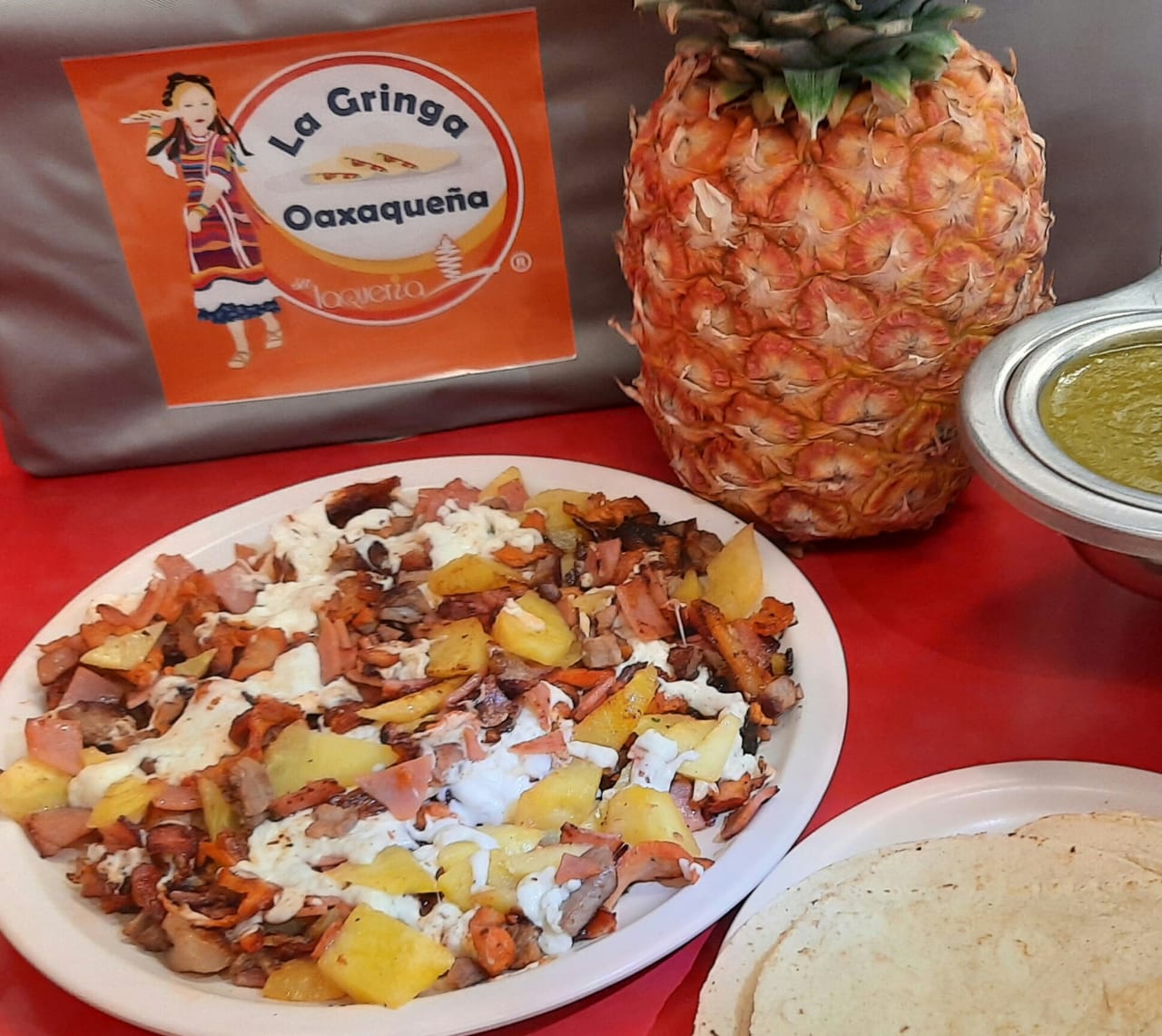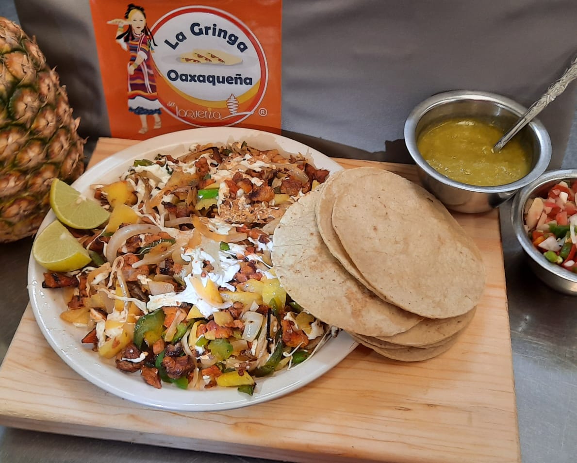 Preparada con bistec, al pastor, jamón, chuleta, piña, quesillo con tortillas de maíz.