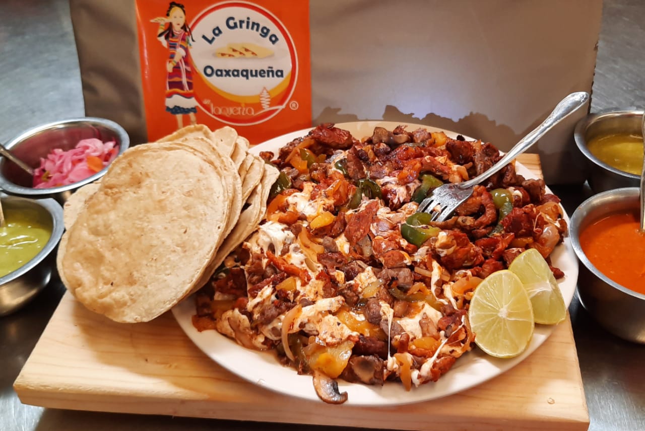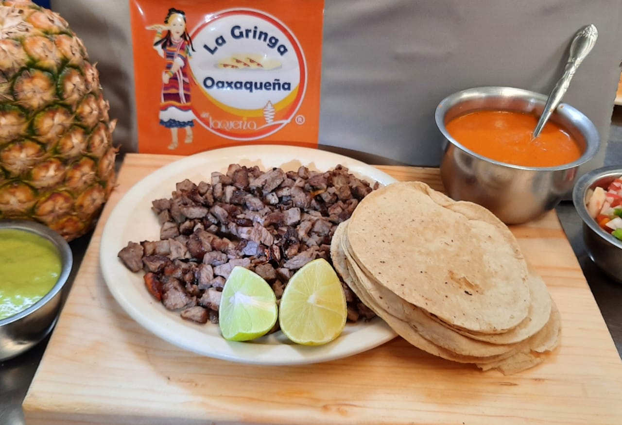 Carne de res picada con carne al pastor, sazonado con tocino, champiñones, jamón, cebolla, chile morrón, chile poblano, piña y delicioso quesillo con tortillas de maíz o harina.