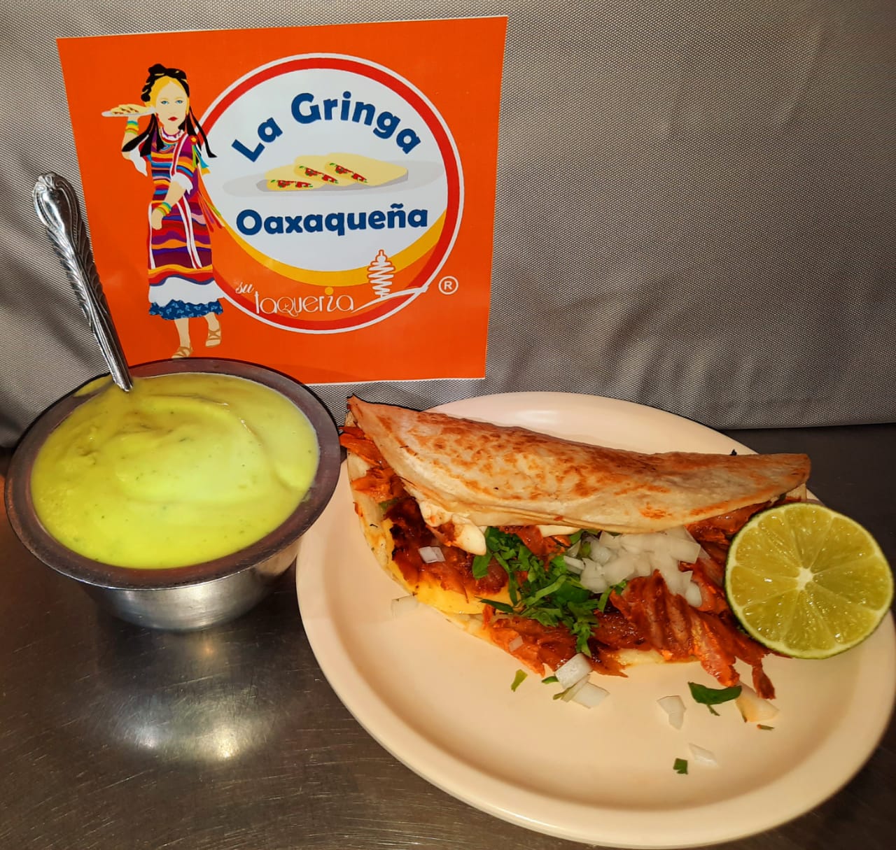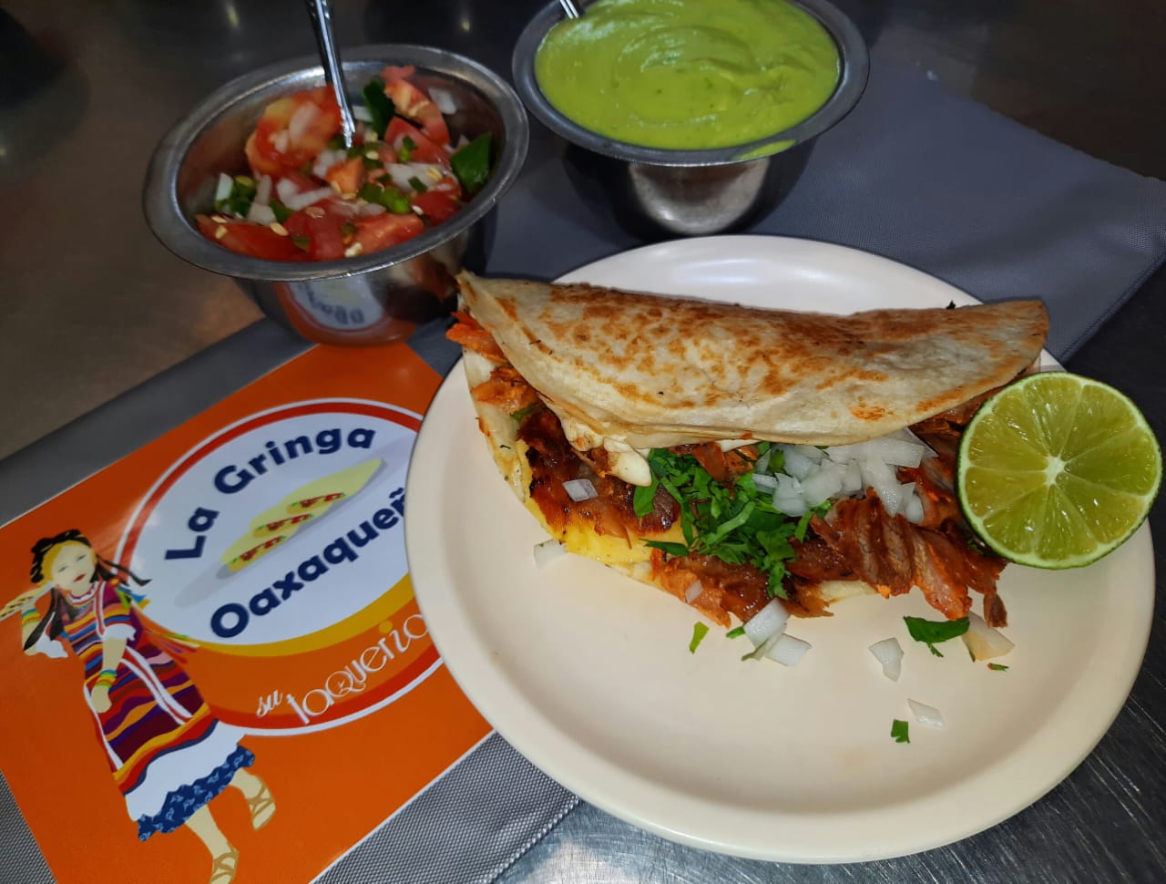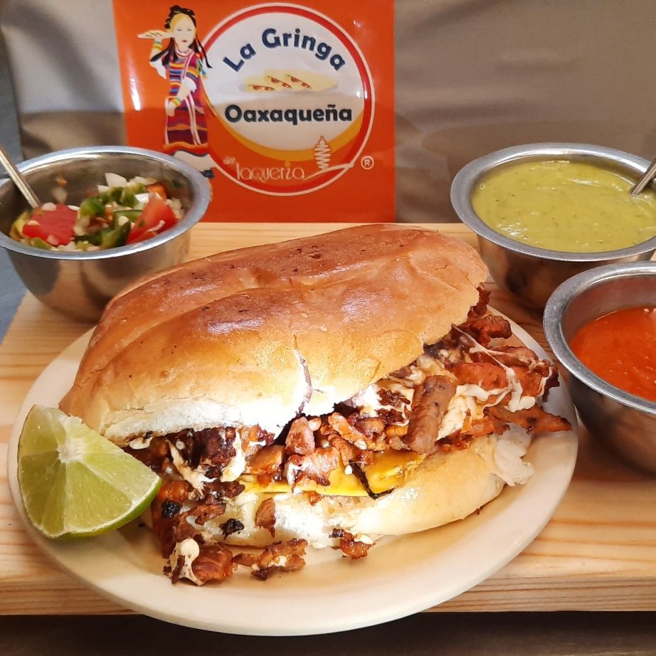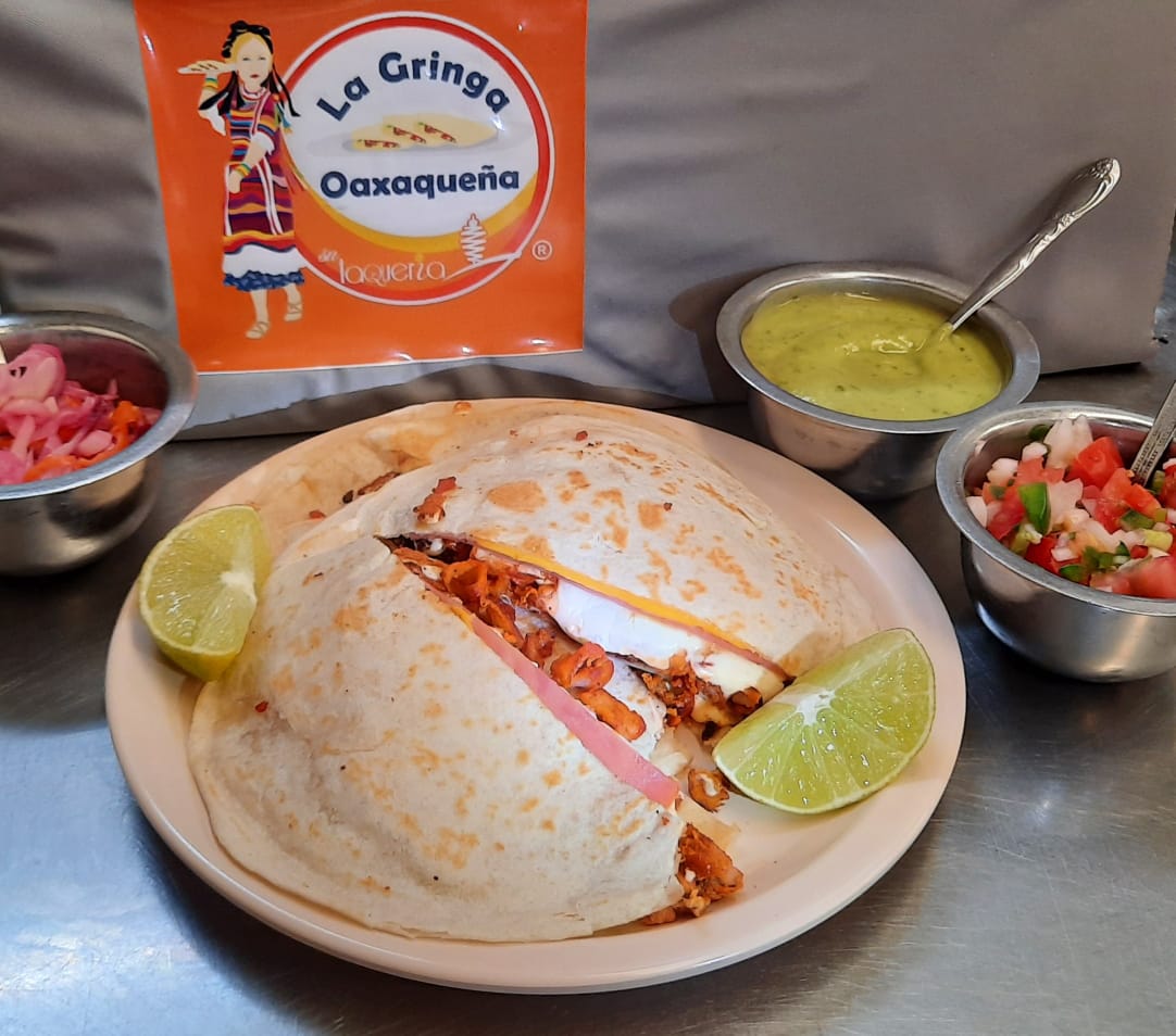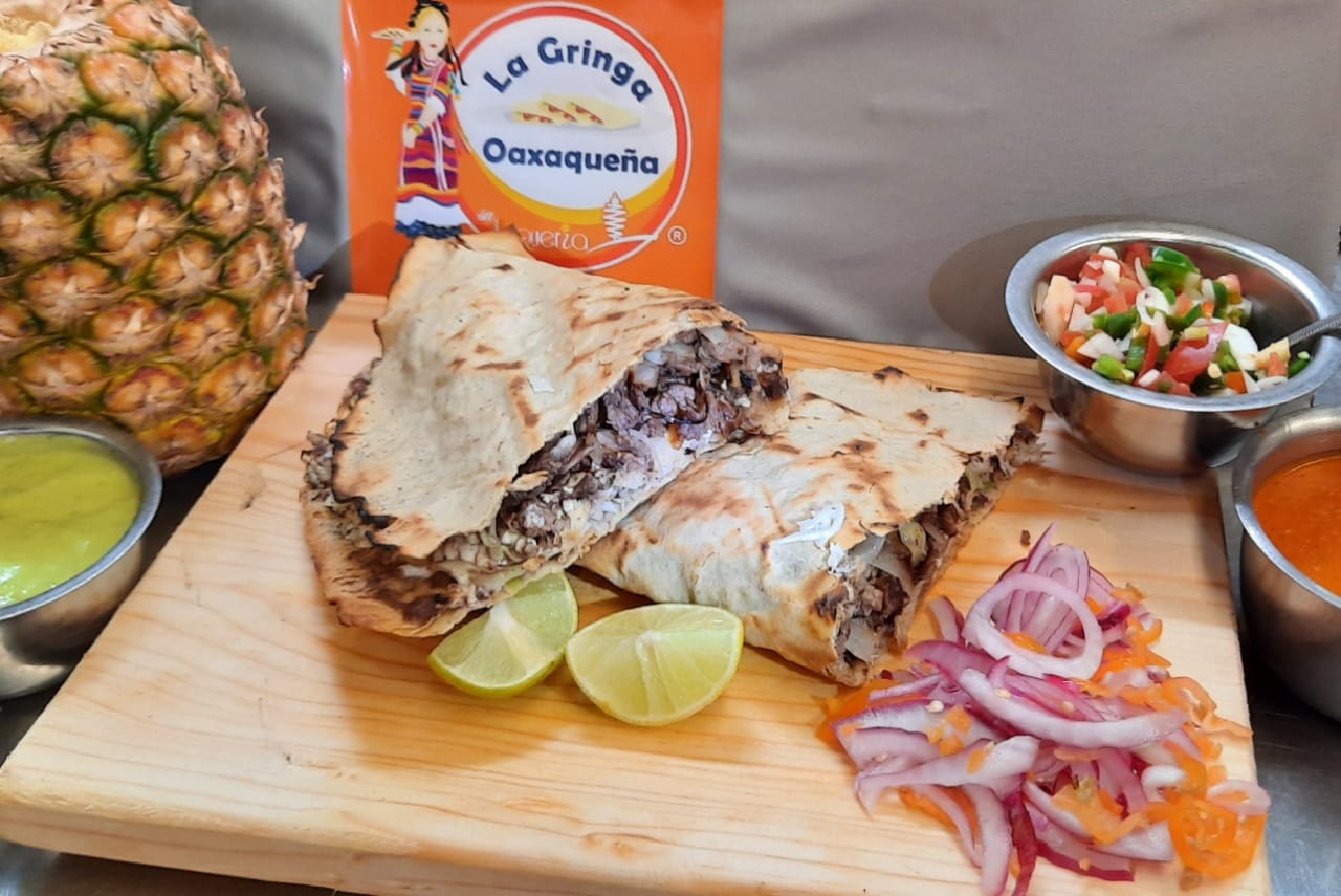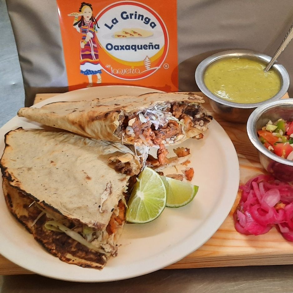 Preparada con una tortilla de harina con carne al pastor y quesillo.