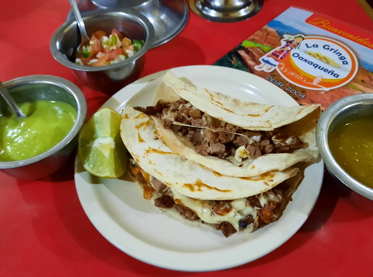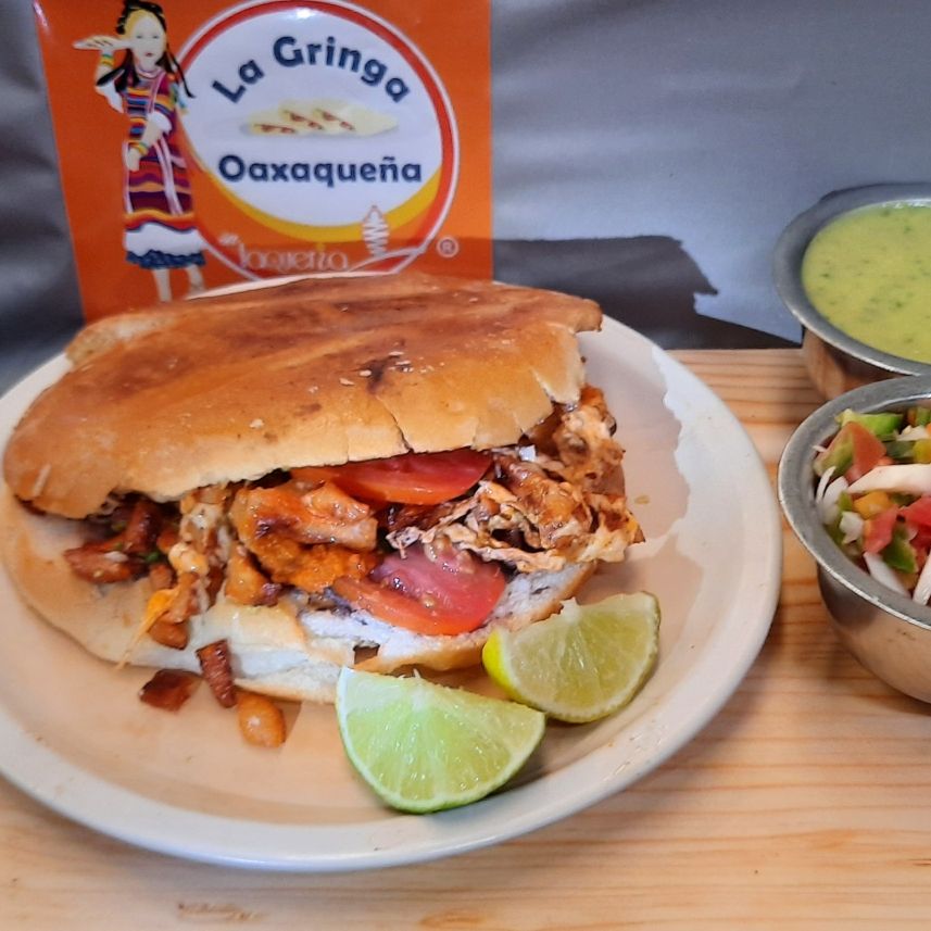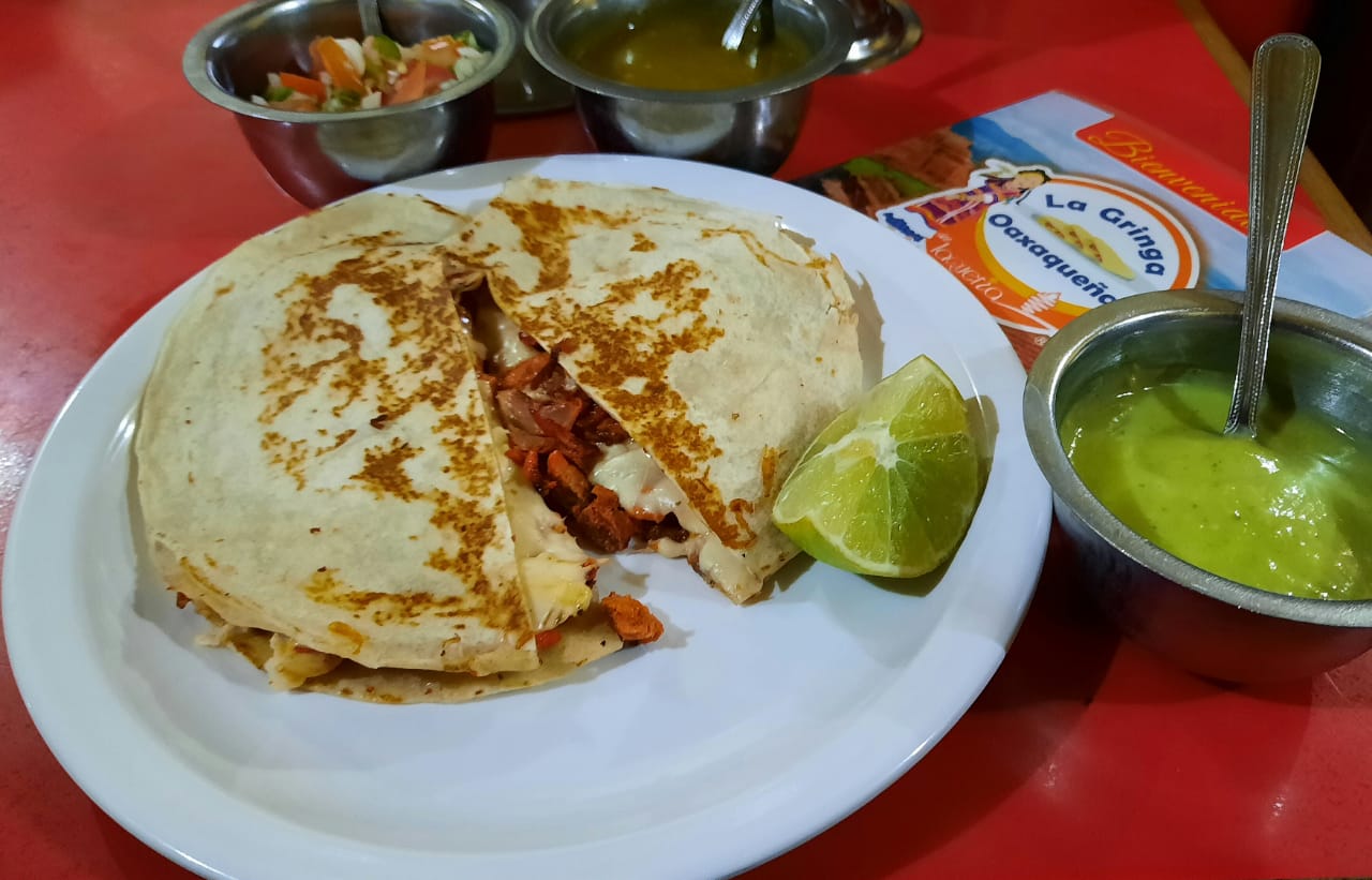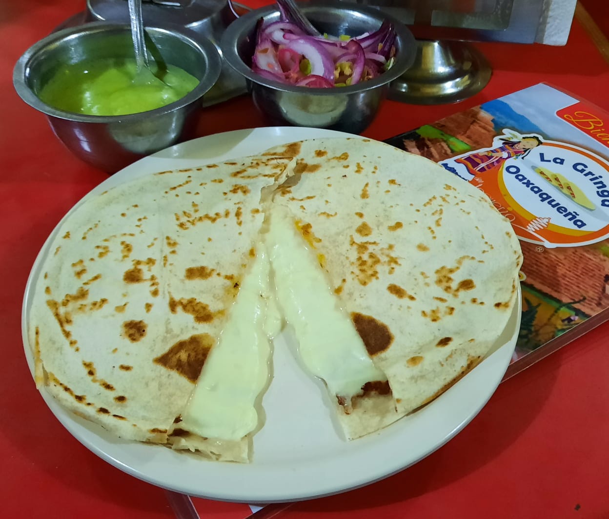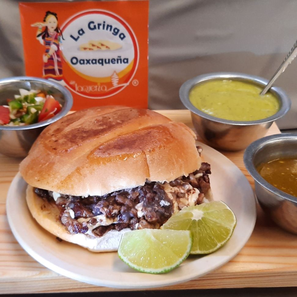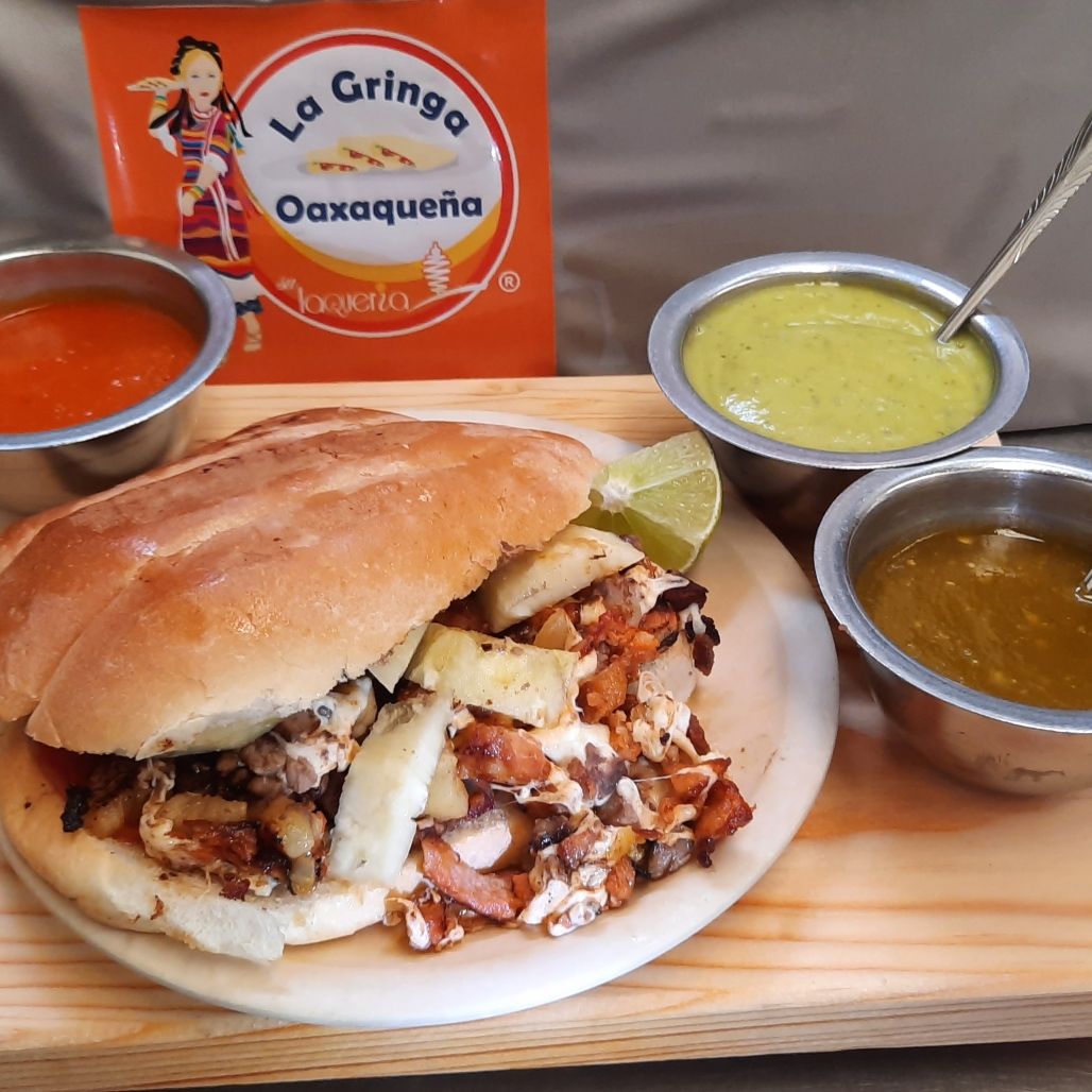 Preparada con una tortilla de harina con carne al pastor y quesillo.