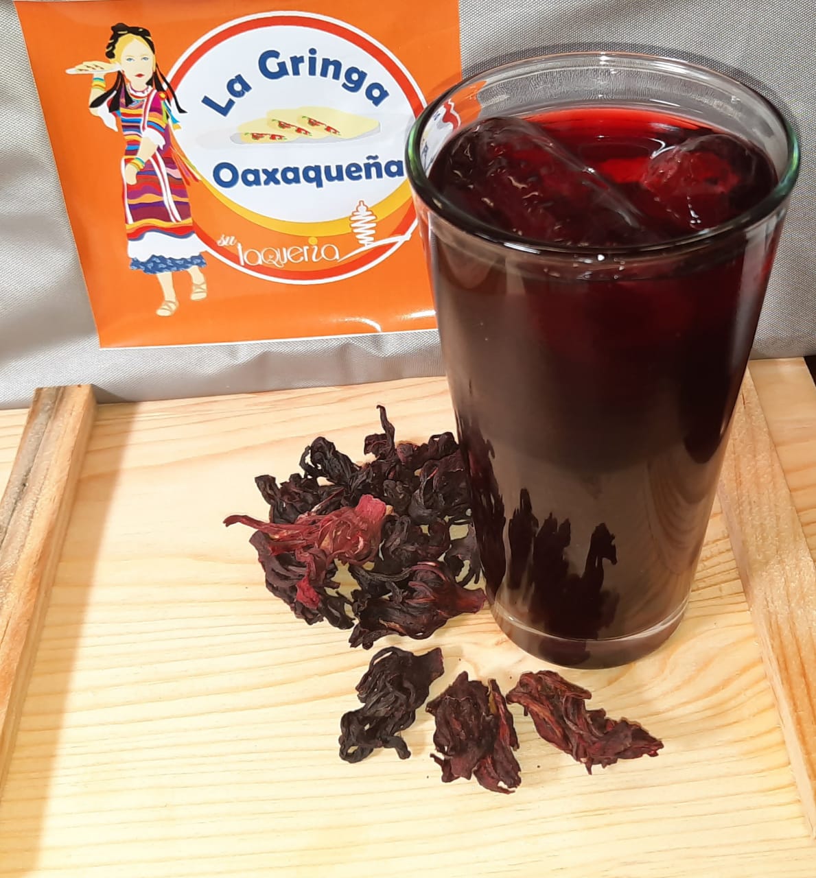 Agua natural sabor Jamaica servida en vaso de 500ml.