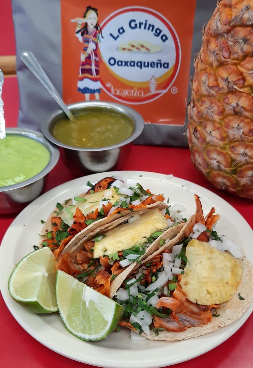 Piña, carne al pastor, cebolla, morrón, tocino y quesillo con tortilla de maíz o harina.