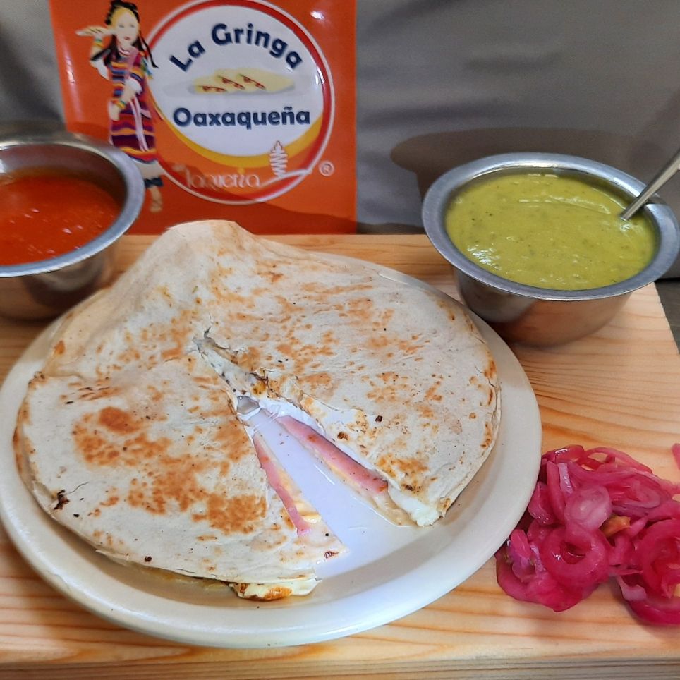 2 Tortillas de harina con queso amarillo, jamón y quesillo.