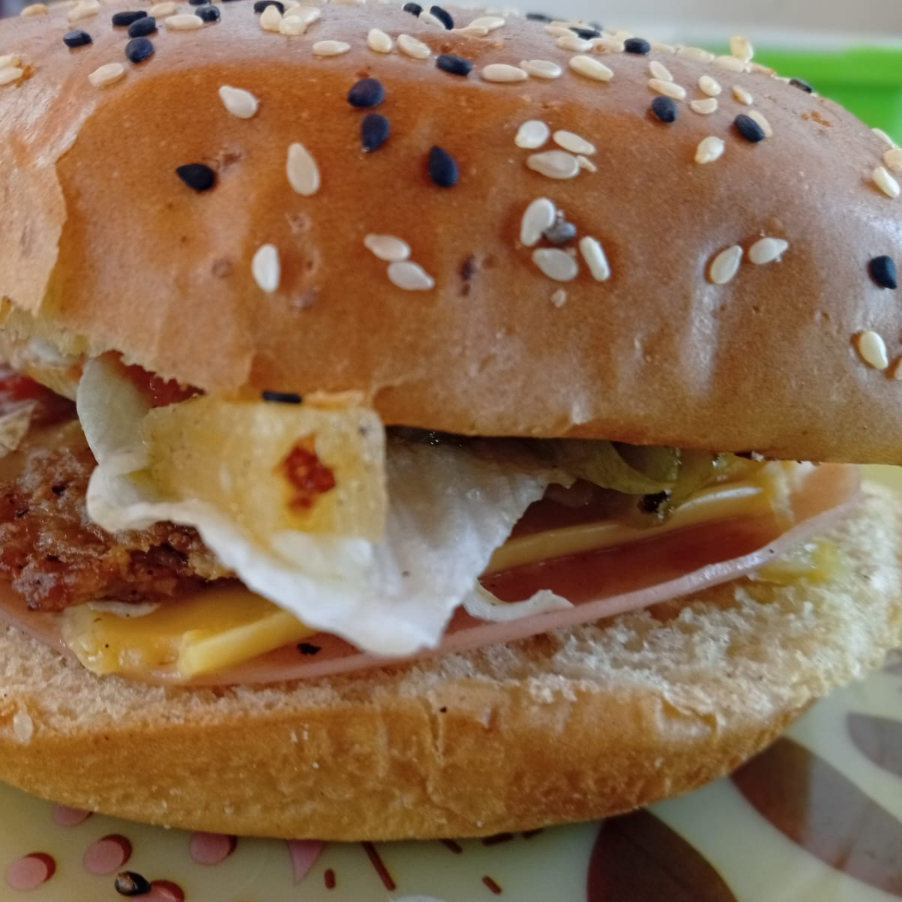 Carne de res, jamón, quesillo, queso amarillo, lechuga, tomate, cebolla caramelizada, chiles en vinagre y aderezos.