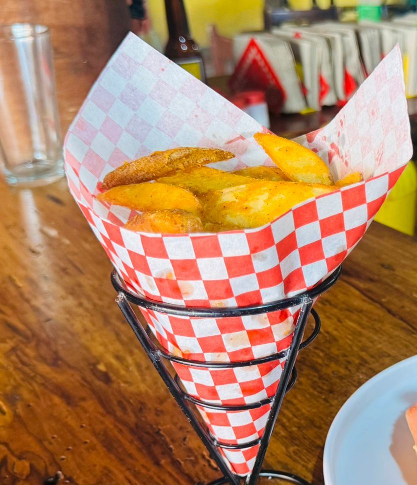 Papas en gajo crocantes, sazonadas con especias de la casa.