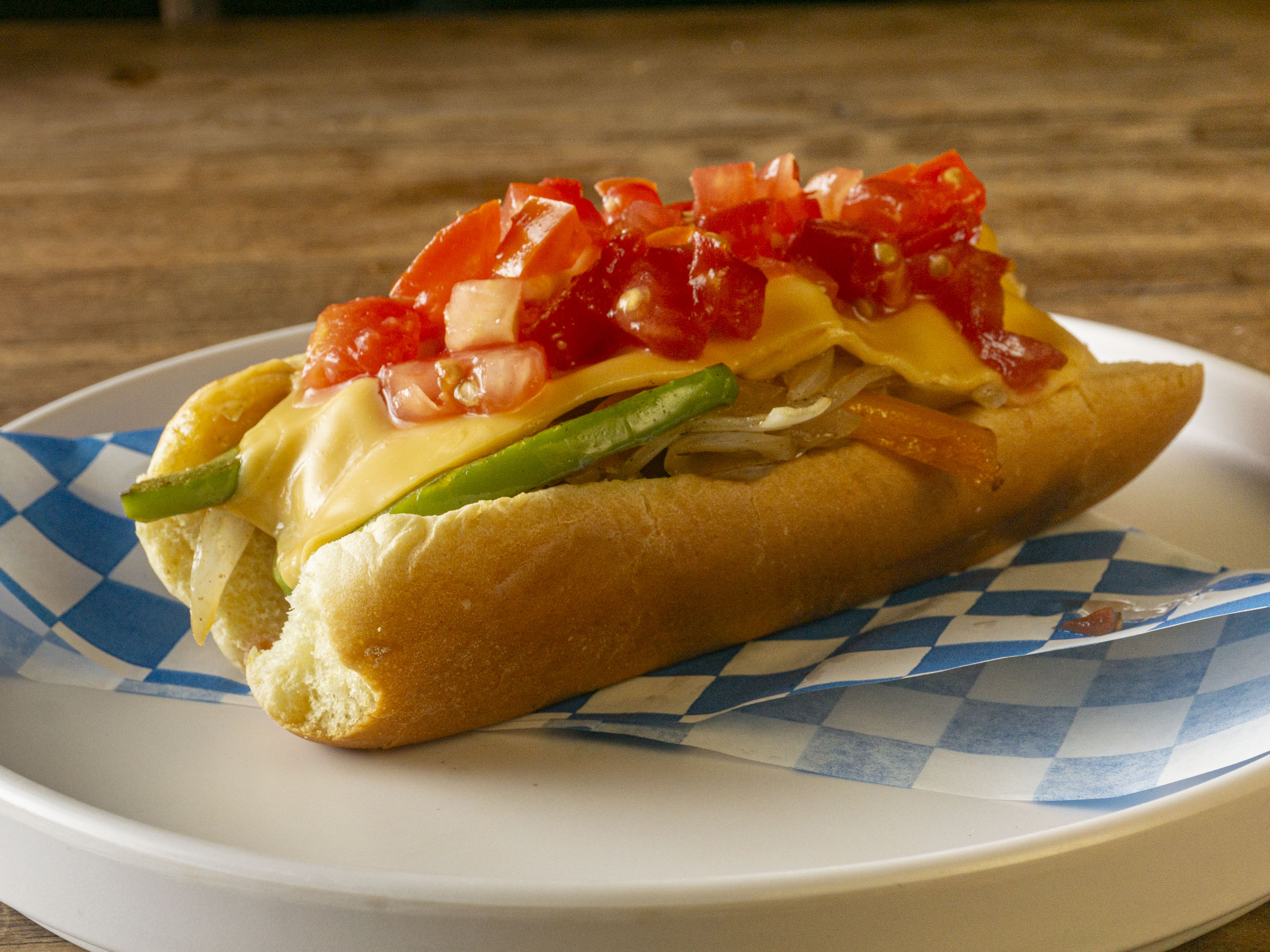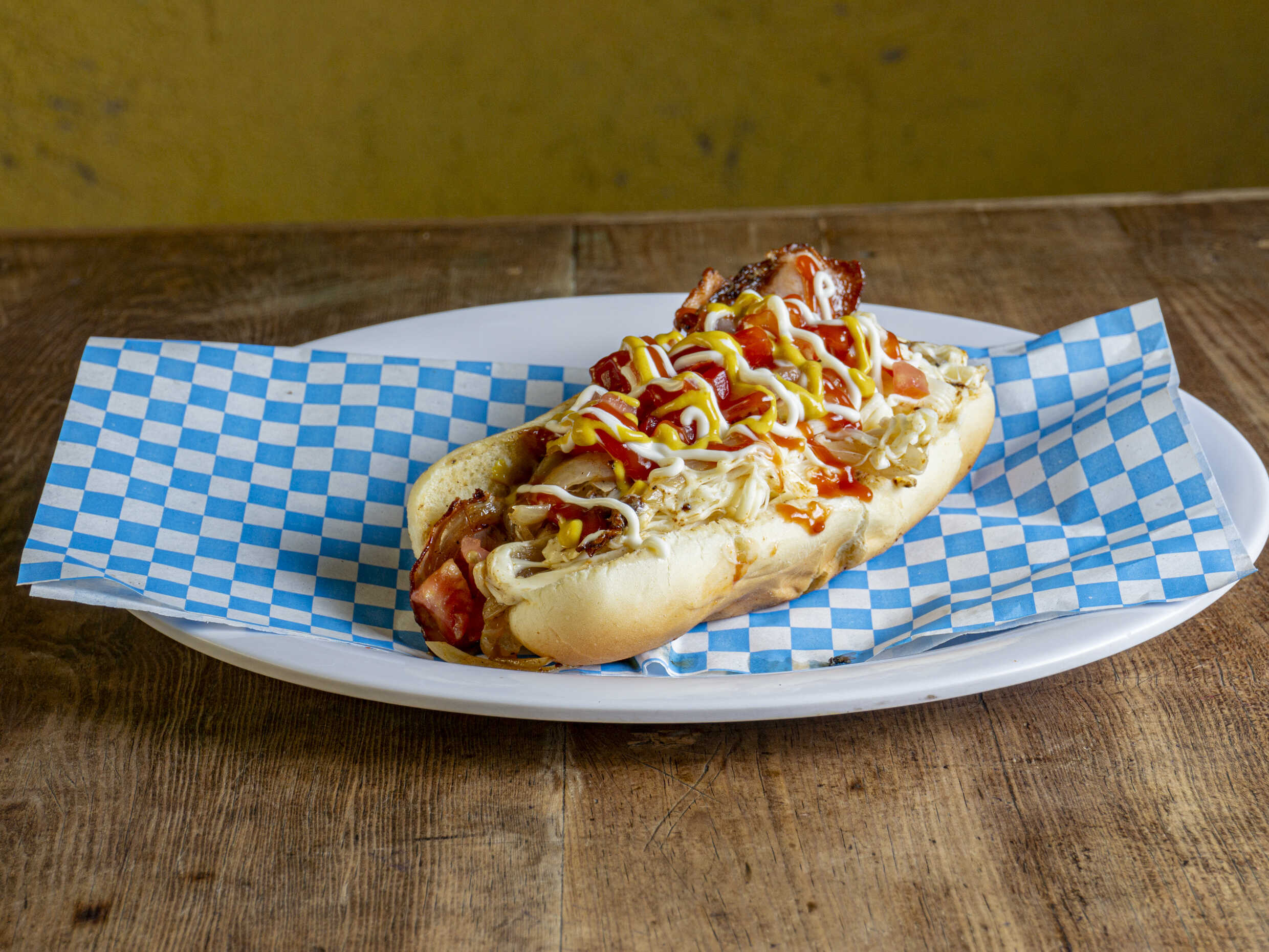Hot dog clasico con Salchicha de pavo 8 a 10 cm y tocino entira, tomate cebolla catsup y chile mayonesa.