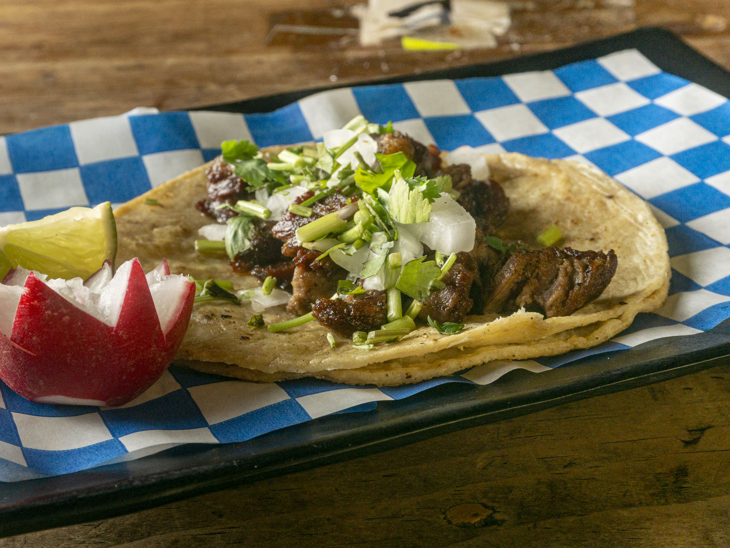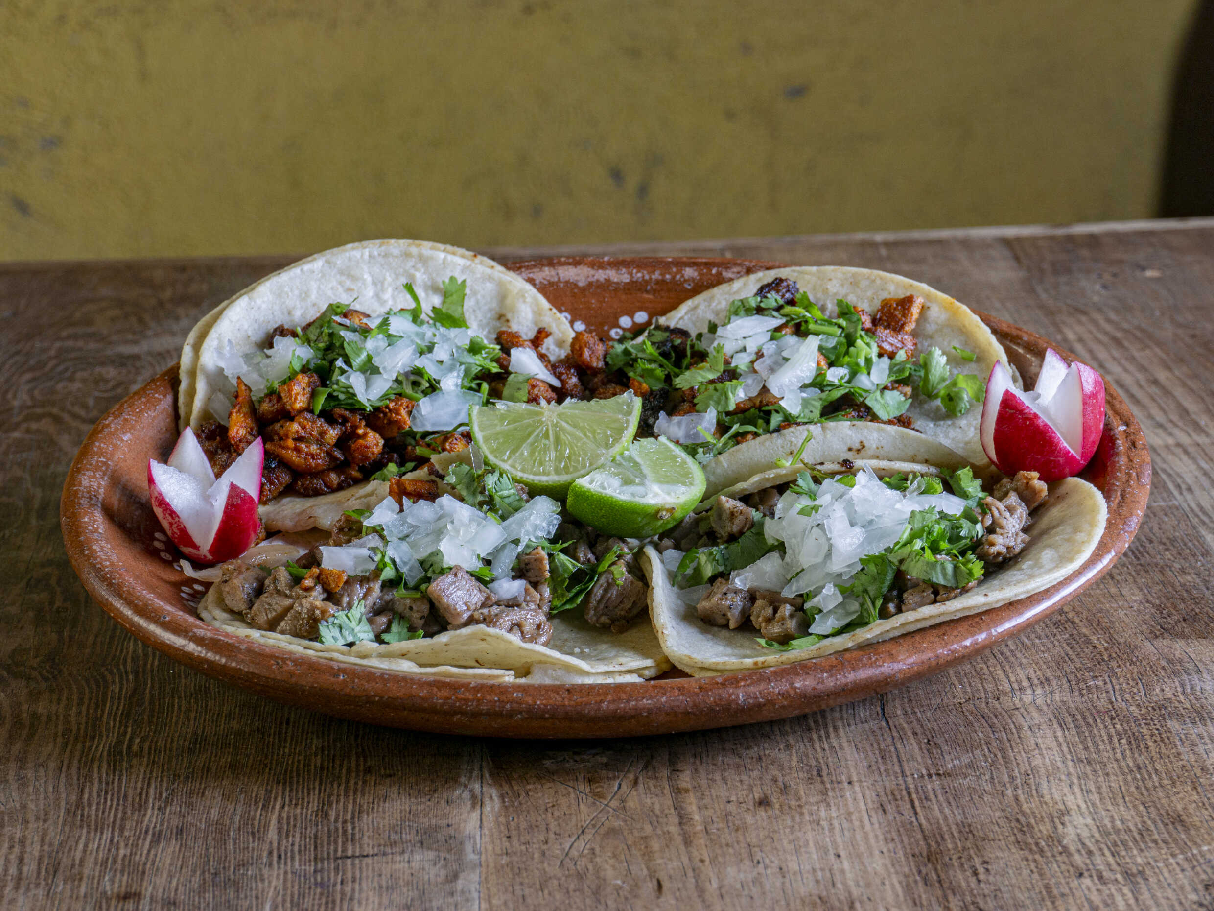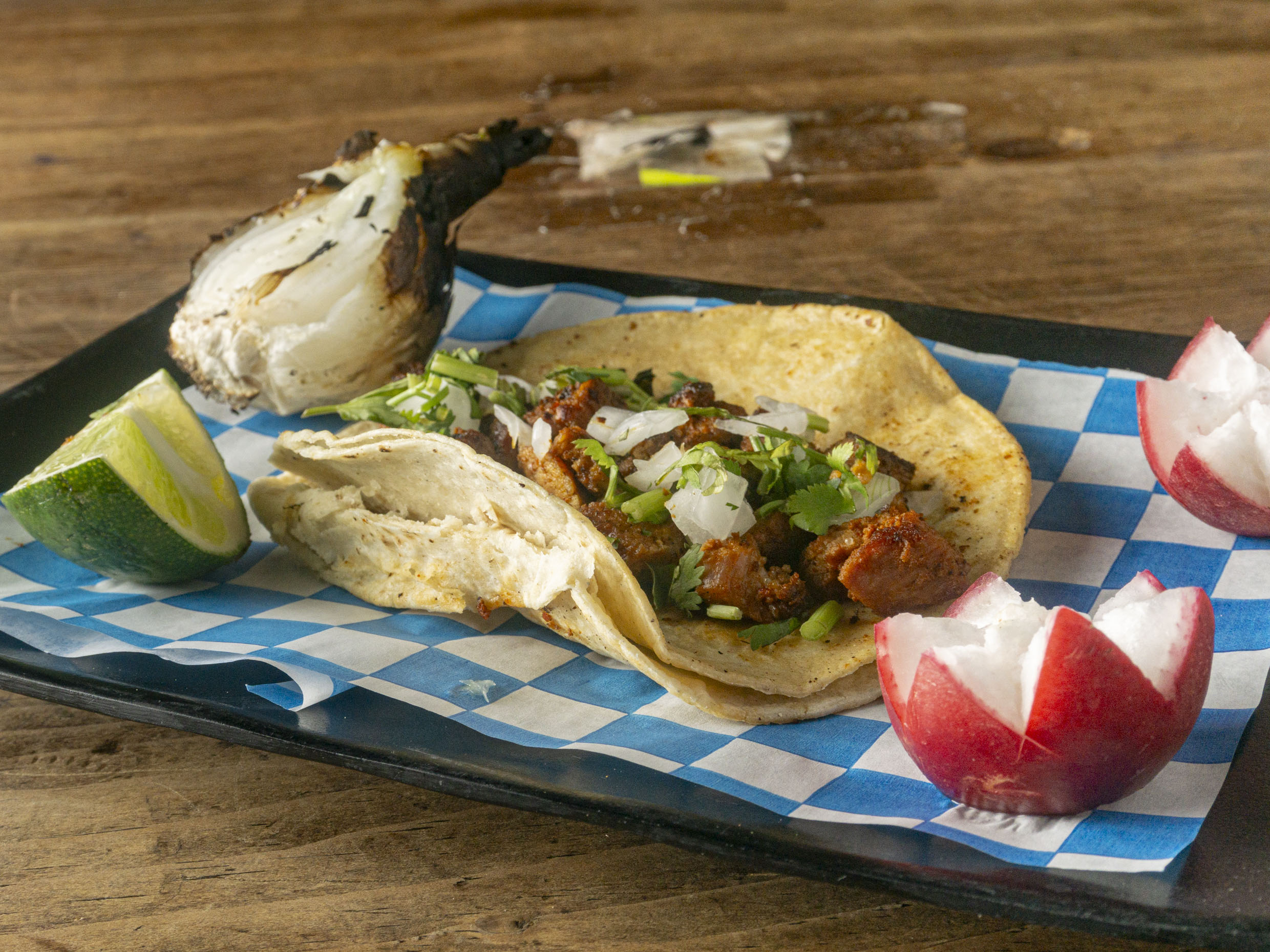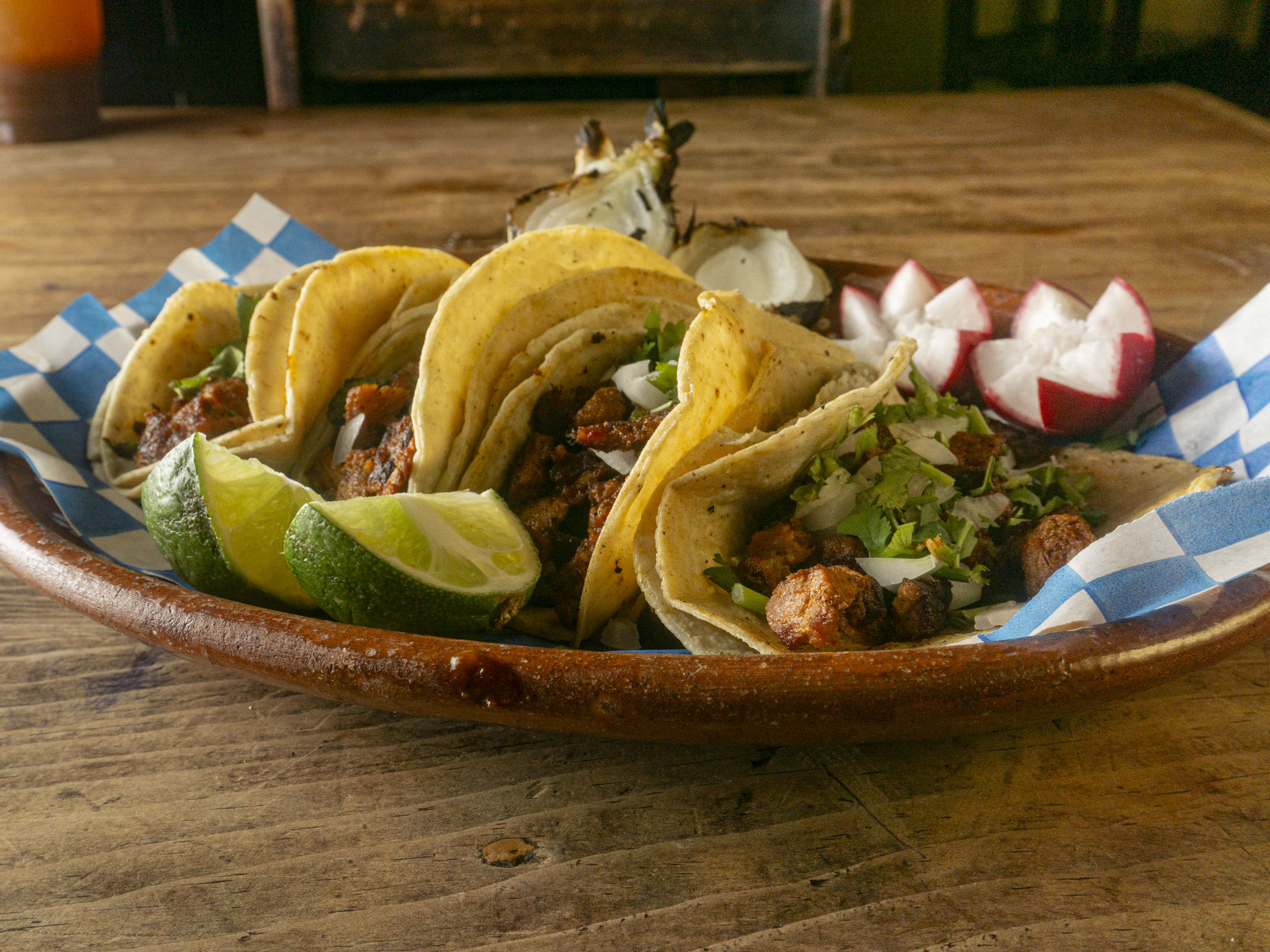 Tacos de asada acompañados de salsa, guacamole, cebollita, rábano y limones