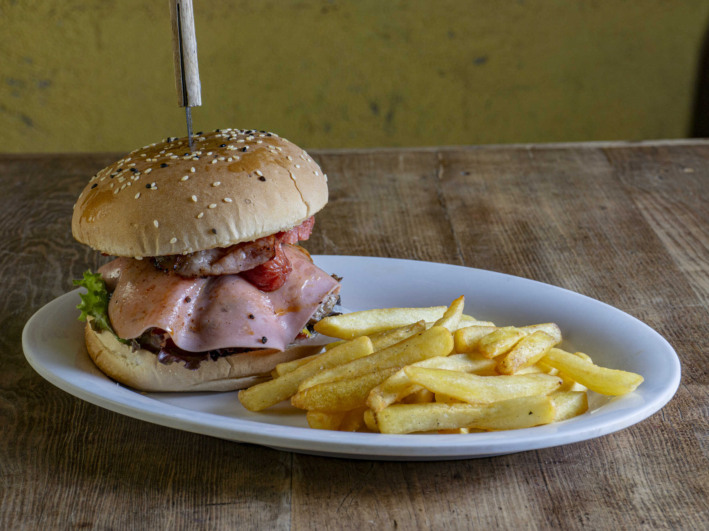 Tocino, salchicha, jamón, manchego y queso americano con papas a la francesa.