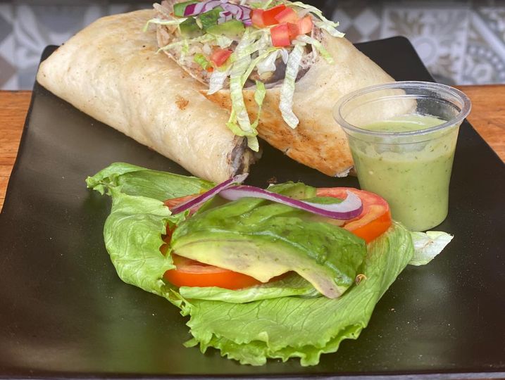 Carne, quesillo, arroz, pico de gallo, crema, aguacate y frijol.