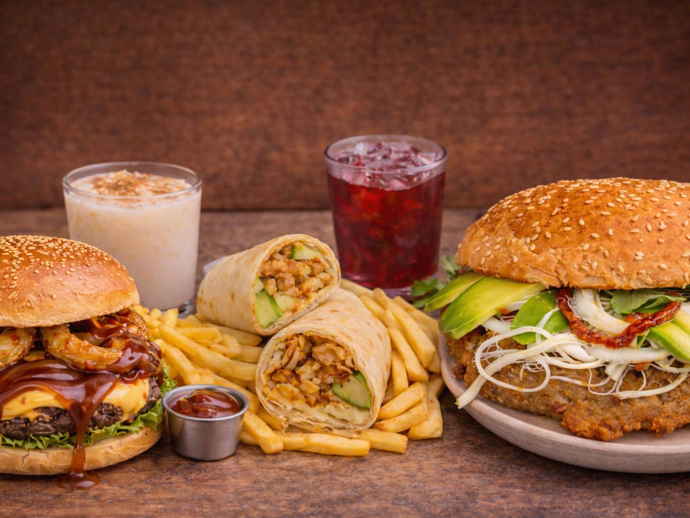 Carne de res, queso gouda, ensalada california, tocino, aros de cebolla y salsa BBQ