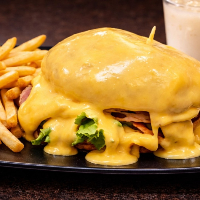 Doble carne, extra queso, tomate, cebolla y lechuga. Incluye agua y papas a la francesa.