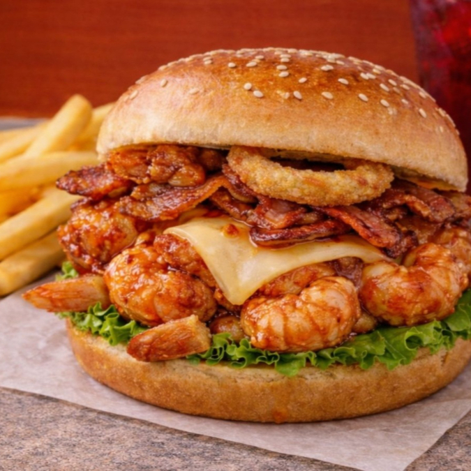 Camarones, lechuga, aros de cebolla, bañado de salsa Tokyo, tocino y queso gouda