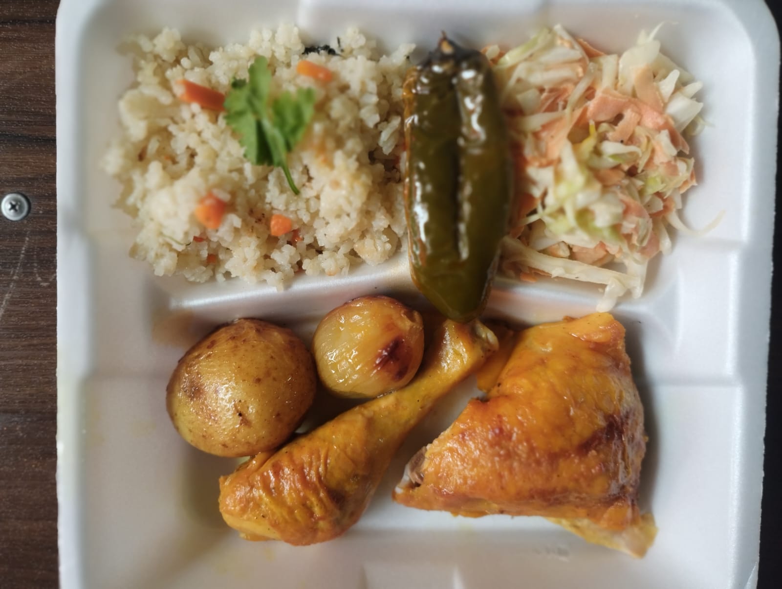 Pollo rostizado con especias, acompañado de guarnición, tortillas y salsa.