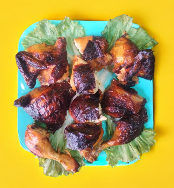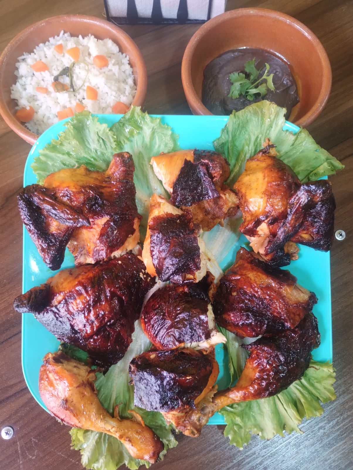 Pollo rostizado con aderezo de tamarindo, acompañado de guarnición, tortillas y salsa.