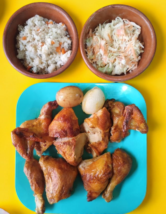 Pollo rostizado con adobo, sin picante, acompañado de guarnición, tortillas y salsa.