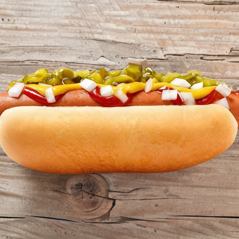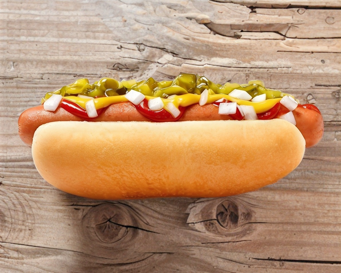 Salchicha de pavo,tomate, cebolla, aderezos