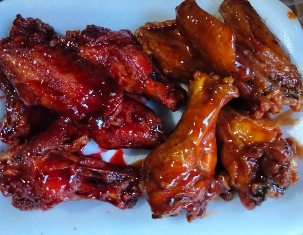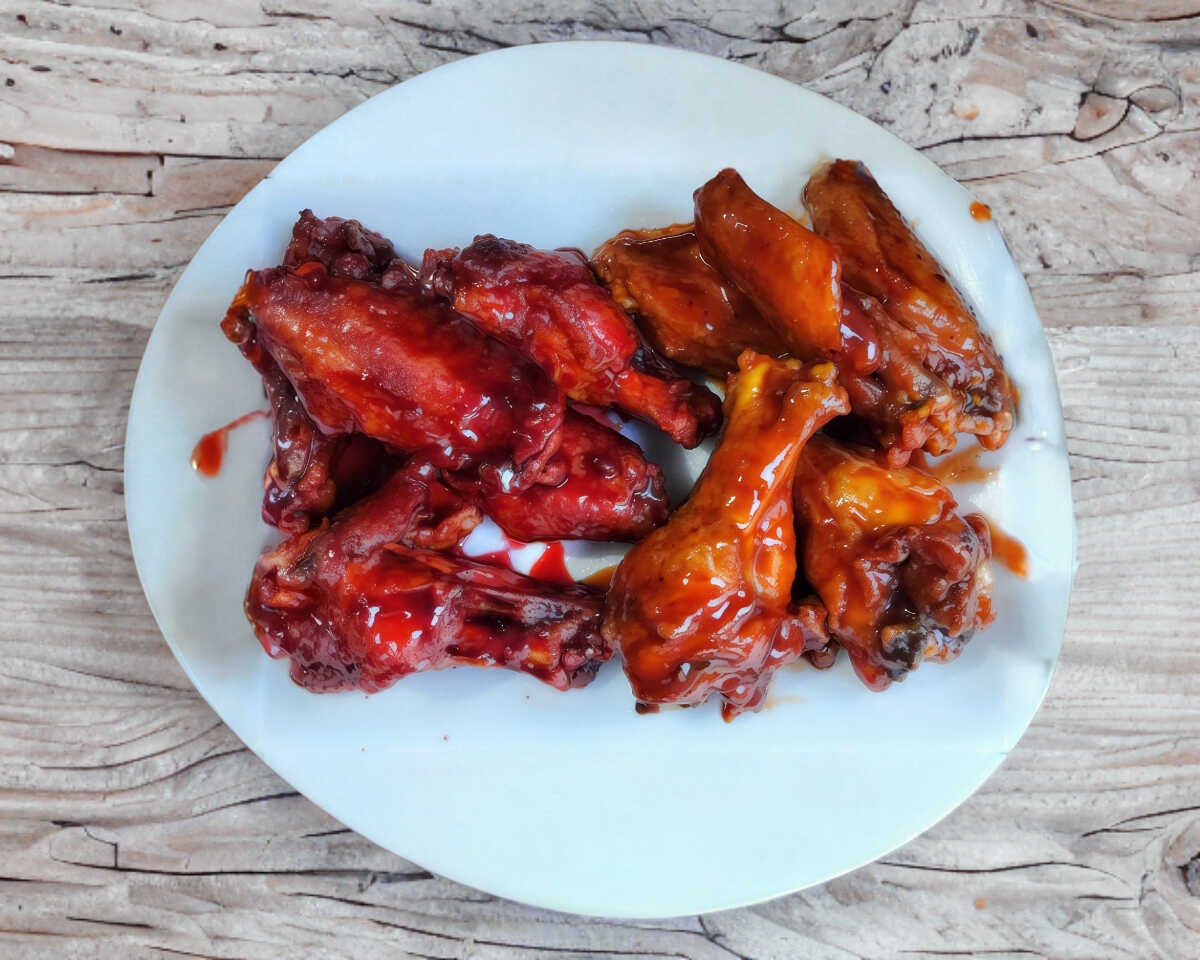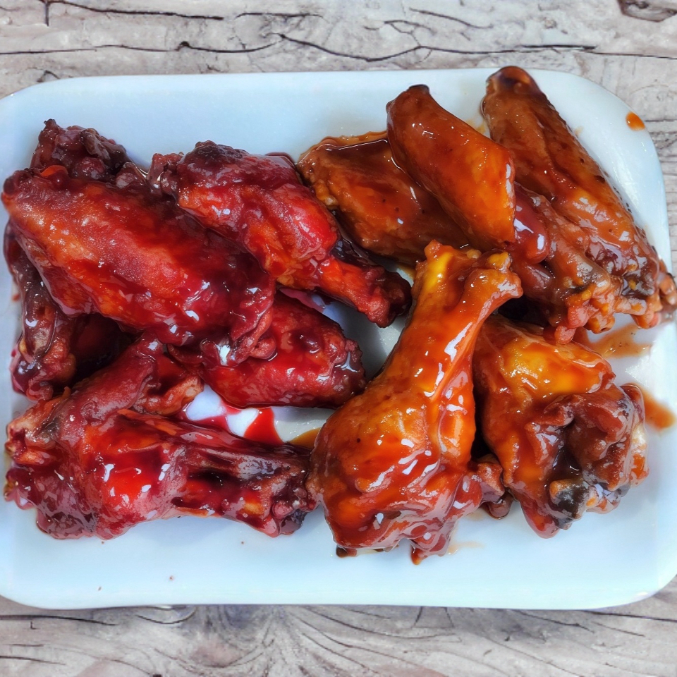 Orden de 8 Alitas Dos salsas a elegir( BBQ Habanero Tamarindo Picoso Mango Habanero Fresa Picosa entre otros ) zanahoria y aderezos