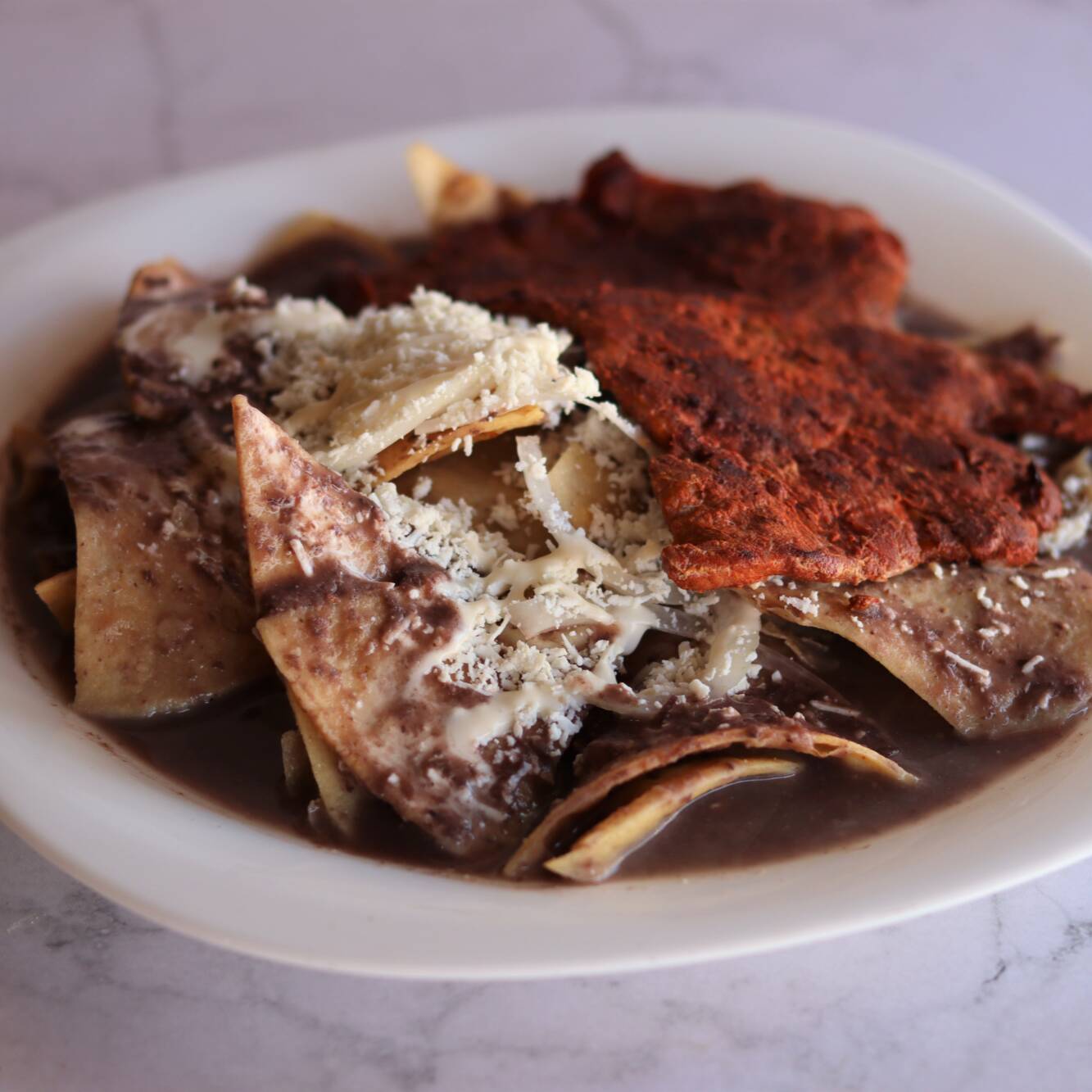 ¡Agua gratis! Tortillas fritas de maíz bañadas en mole acompañadas de queso, crema y cebolla.