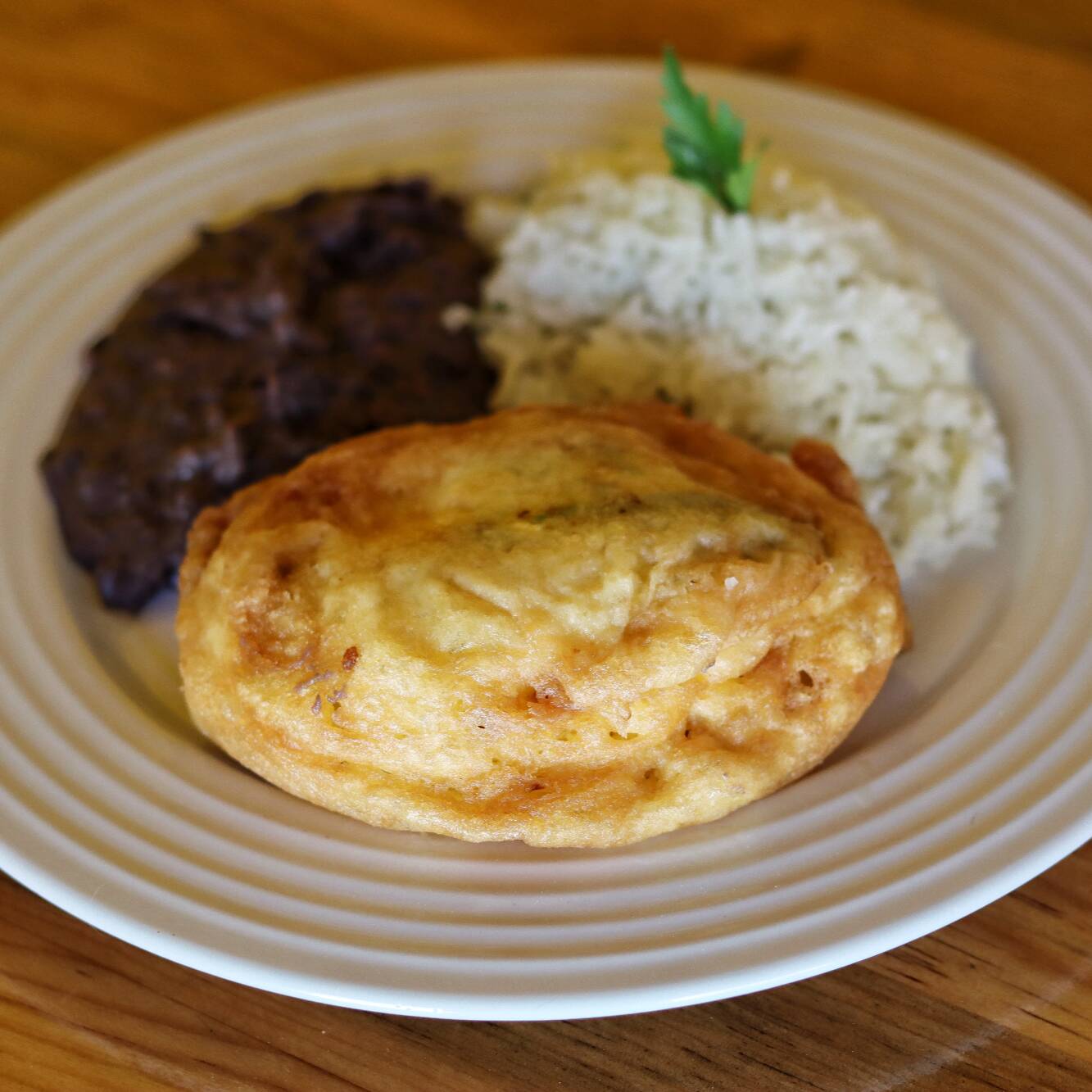 ¡Agua gratis! Omelette de quesillo acompañados con frijol y queso.