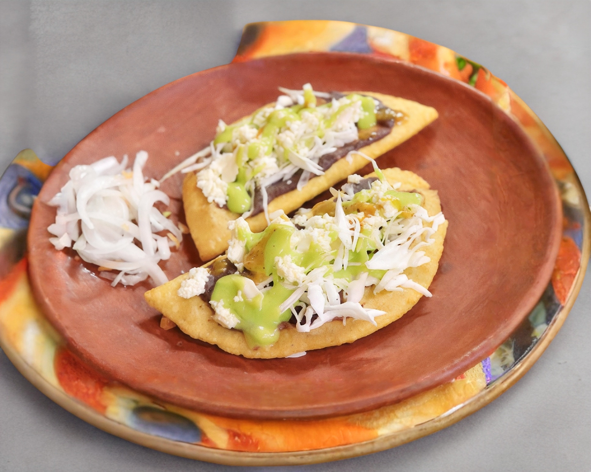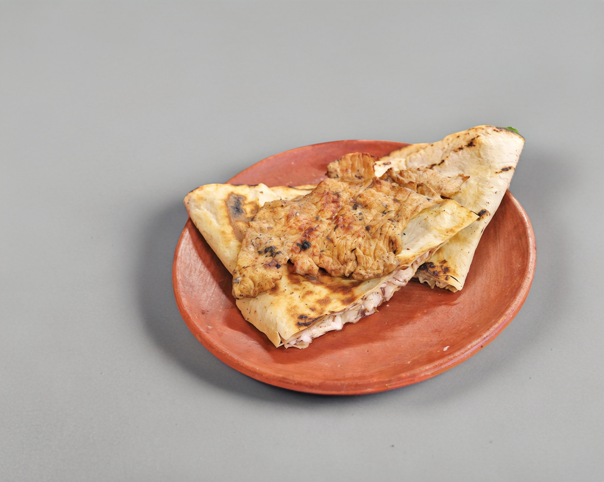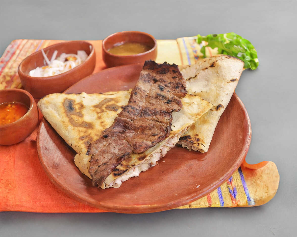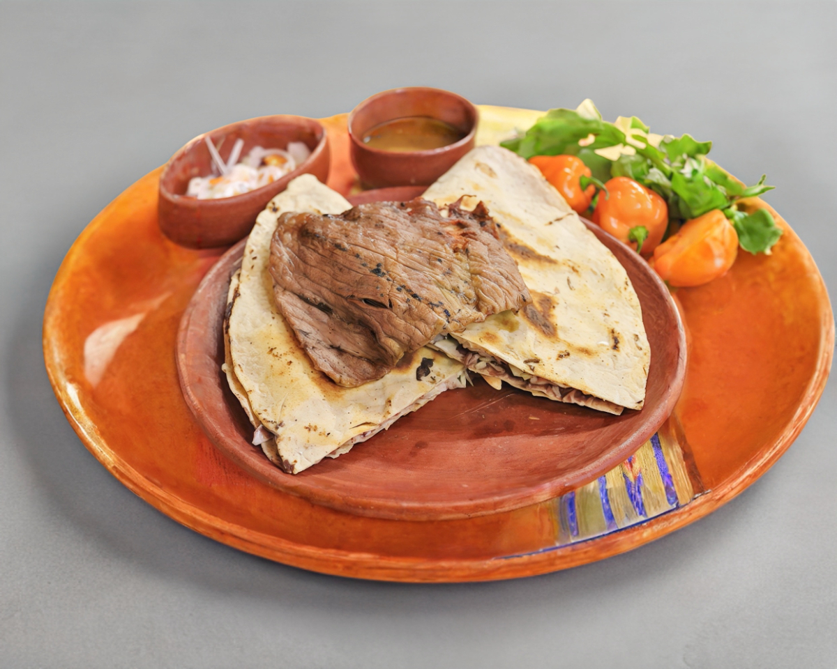1 Quesadilla rellena de quesillo acompañada de frijol, queso, salsa y guacamole.
