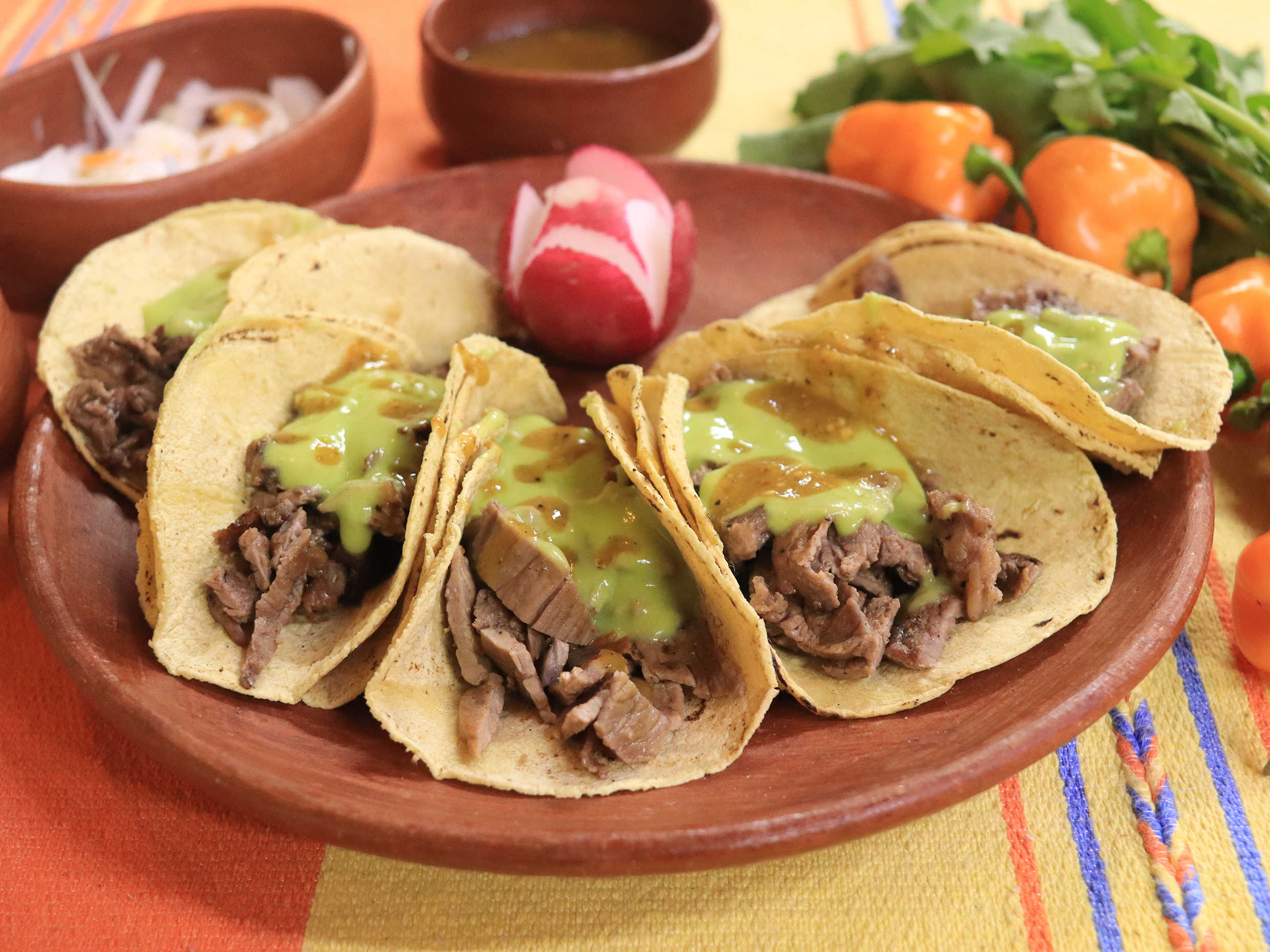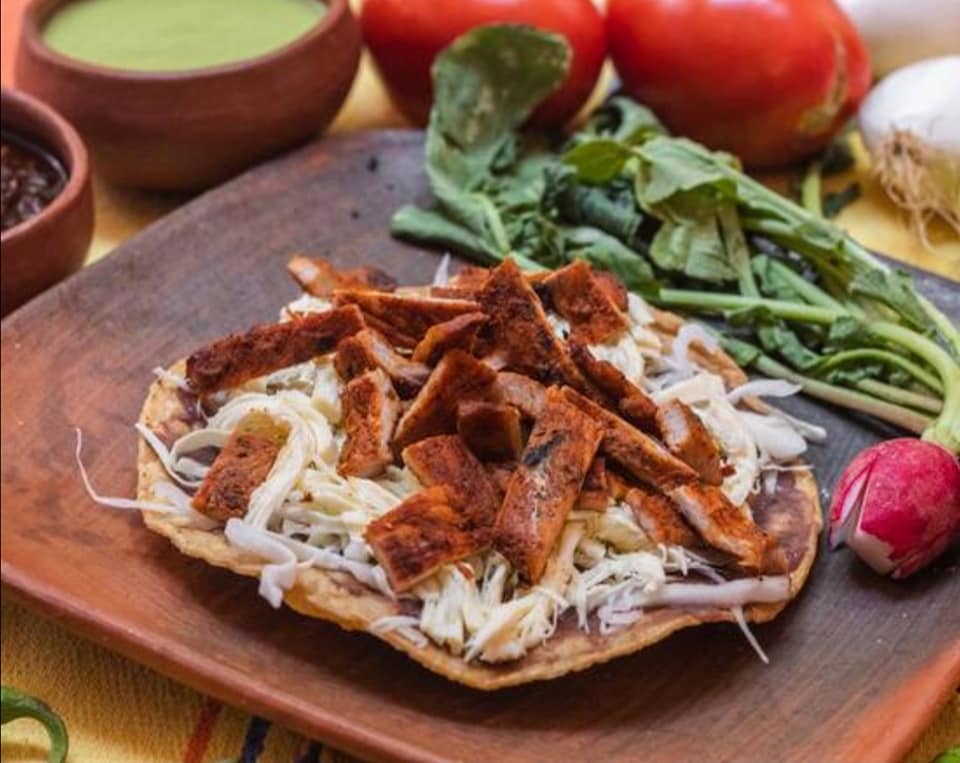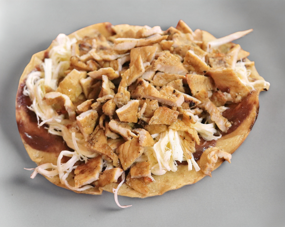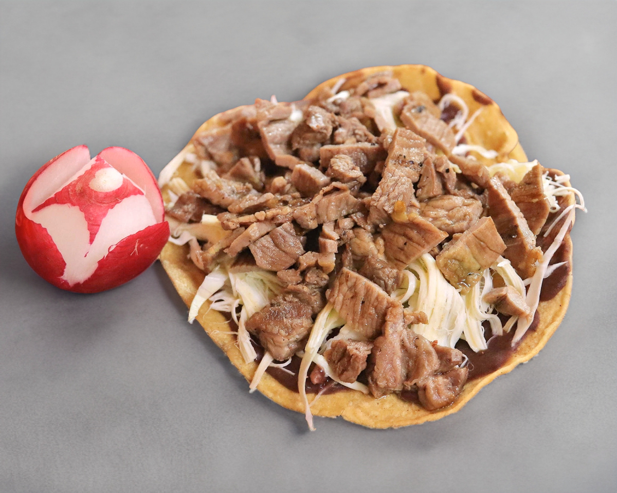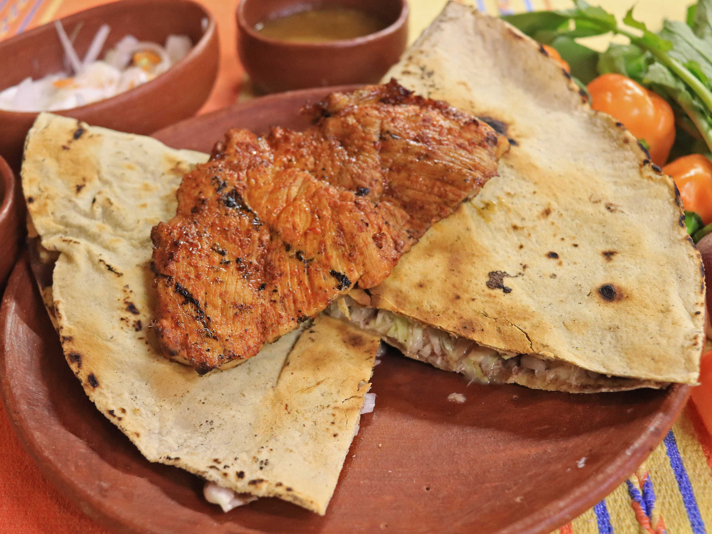 Pan Chapata con frijol, mayonesa, falda enchilada, quesillo y lechuga