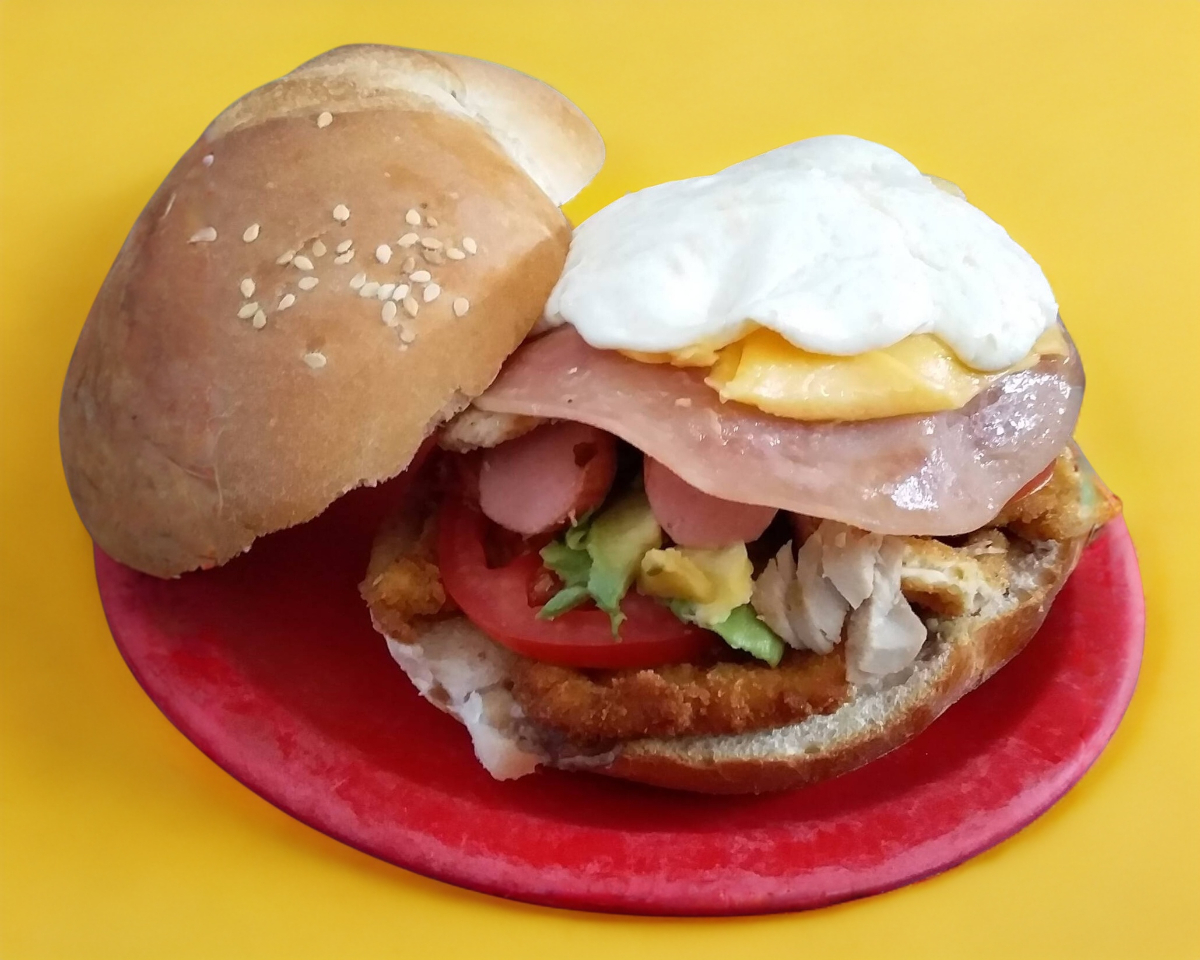Pan amarillo tradicional, mayonesa, fríjol, pierna de cerdo horneada, milanesa de pollo, jamón de pavo y salchicha a la plancha, queso amarillo y quesillo fundido y salsa o picante de la casa.