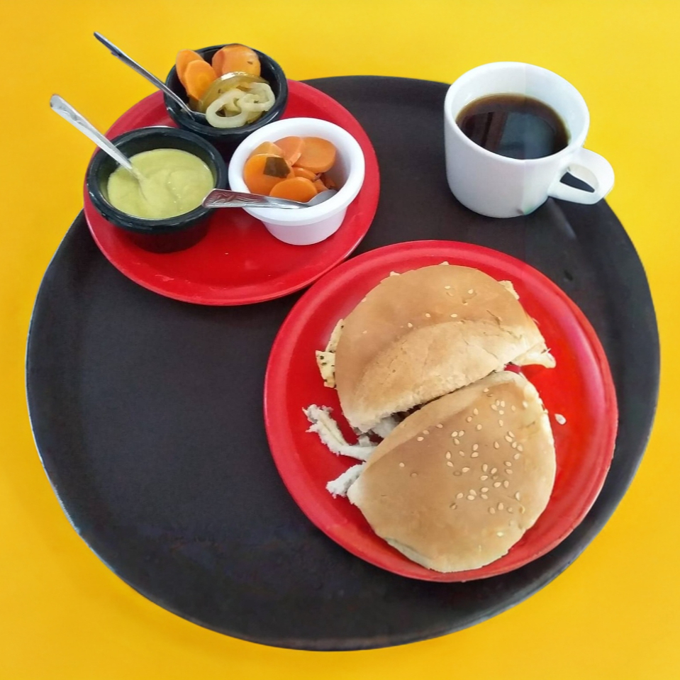 Cochinita pibil elaborada de manera tradicional y artesanal, pan amarillo tradicional, mayonesa, fríjol, aguacate, tomate y salsa especial para la cochinita pibil.