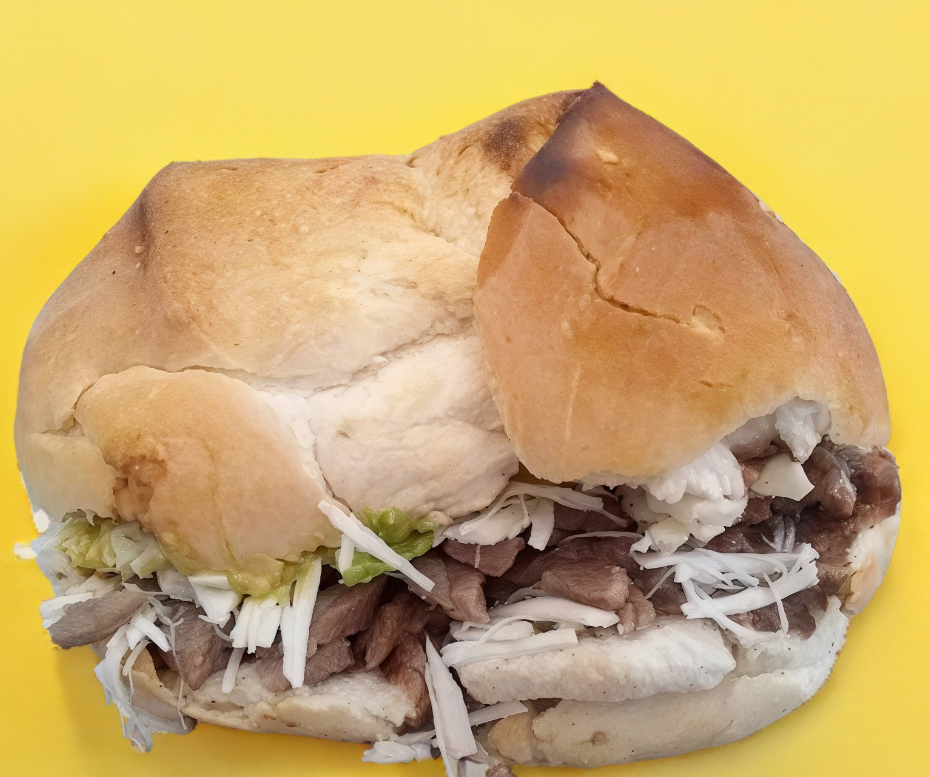 Pan amarillo, mayonesa, frijol, tomate, aguacate, cecina, salchicha oaxaqueña, quesillo y chicharrón.
