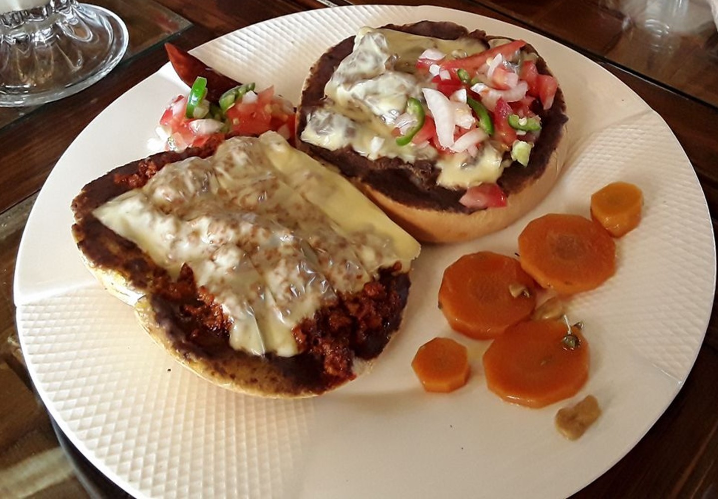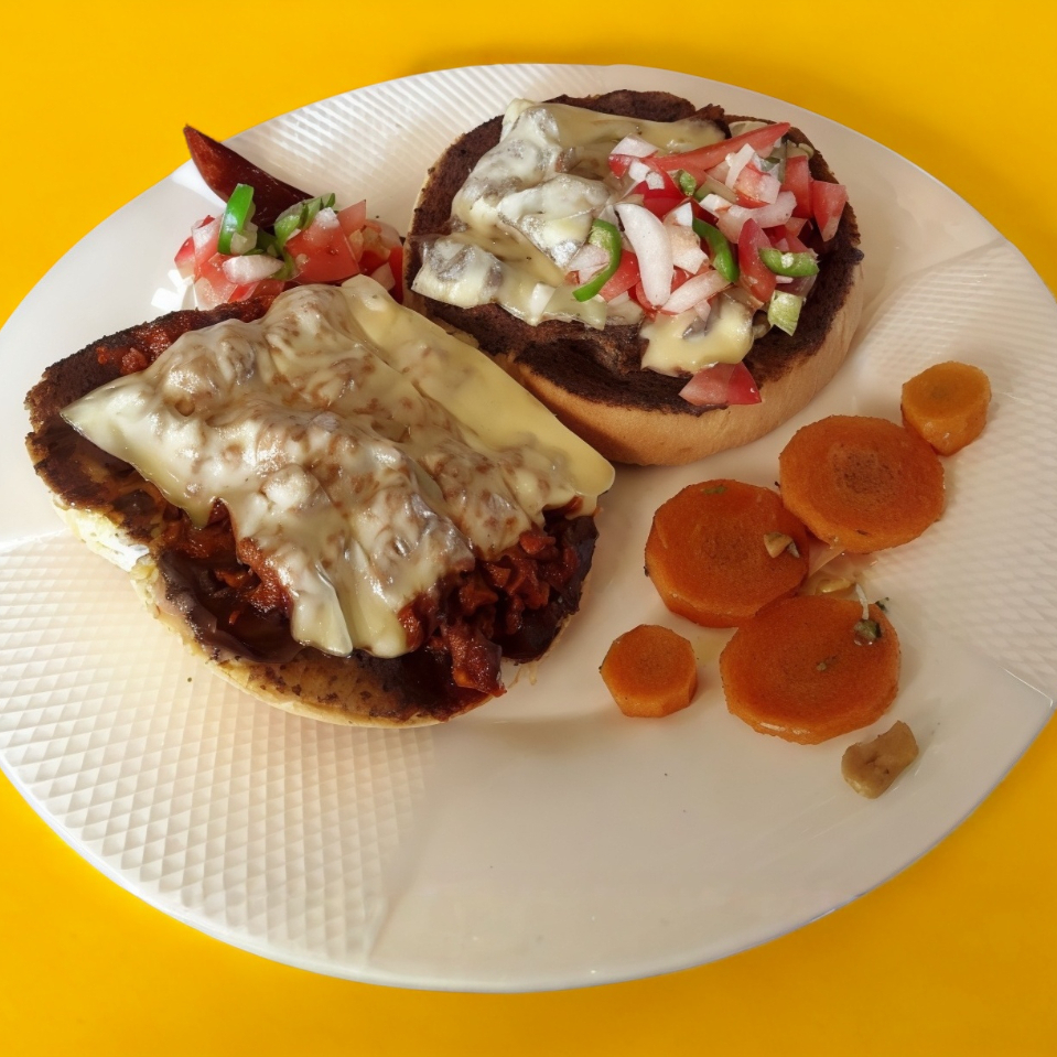 Molletes horneados de pan amarillo, mantequilla, fríjol, chorizo y queso manchego.