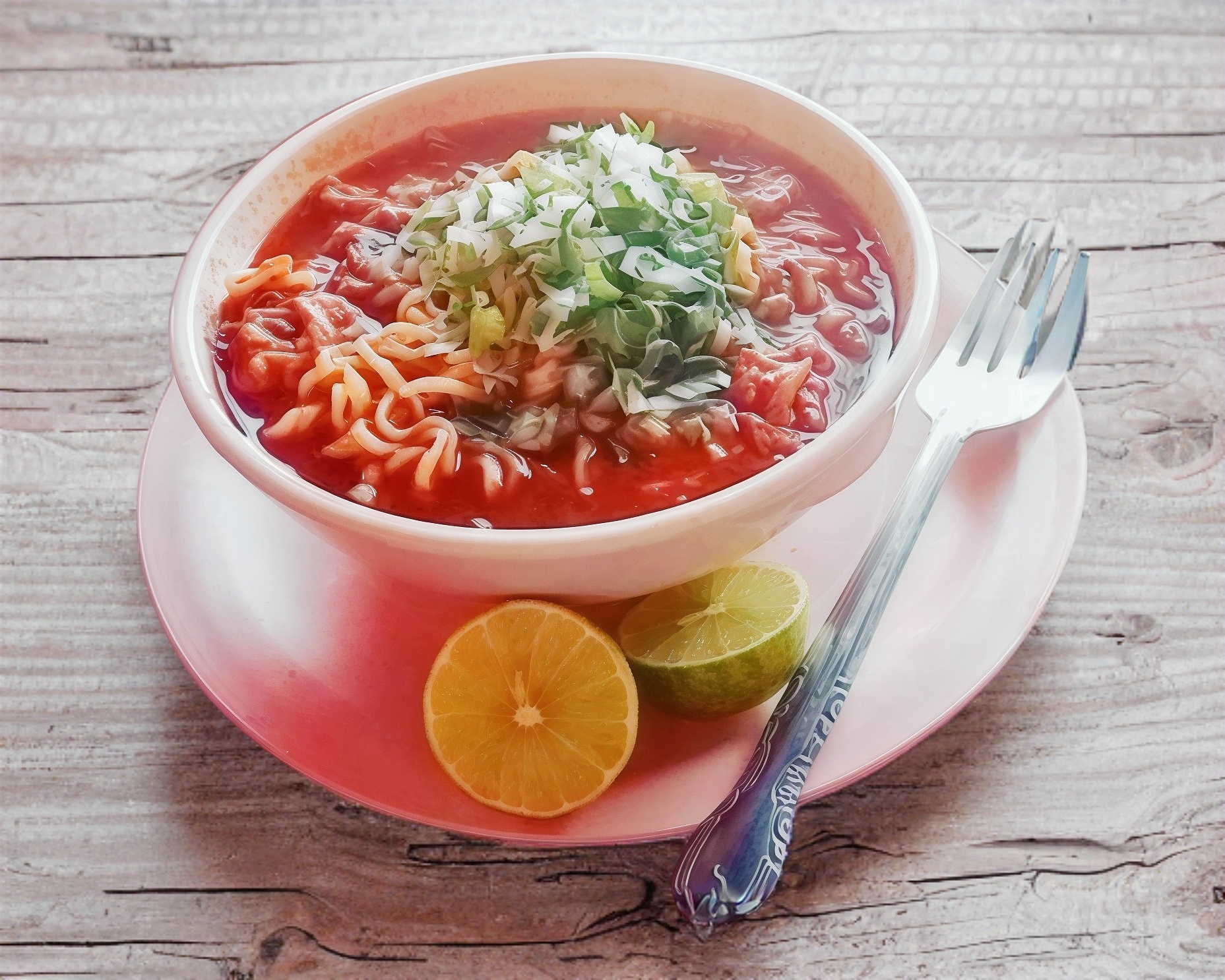 Pasta ramen con consomé de birria de res, carne de birria y cebollín.