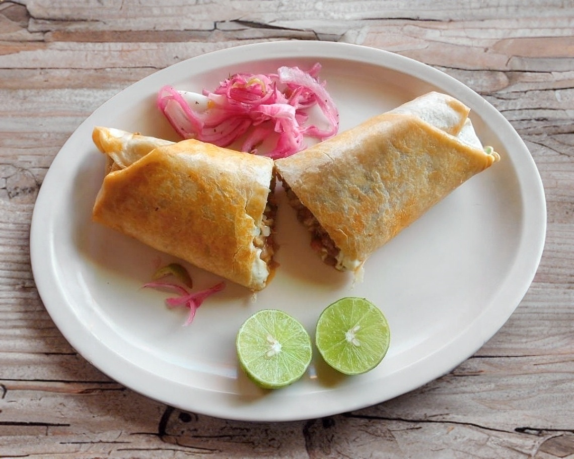 Quesillo, frijoles bayos, carne de birria y verdura envueltos en una tortilla de harina grande.