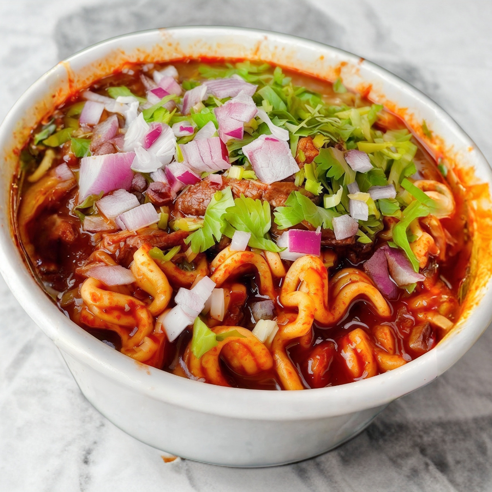 MEDIO LITRO DE CONSOME, ACOMPAÑADO CON PASTA RAMEN, QUESILLO Y CARNE DE BIRRIA DE RES