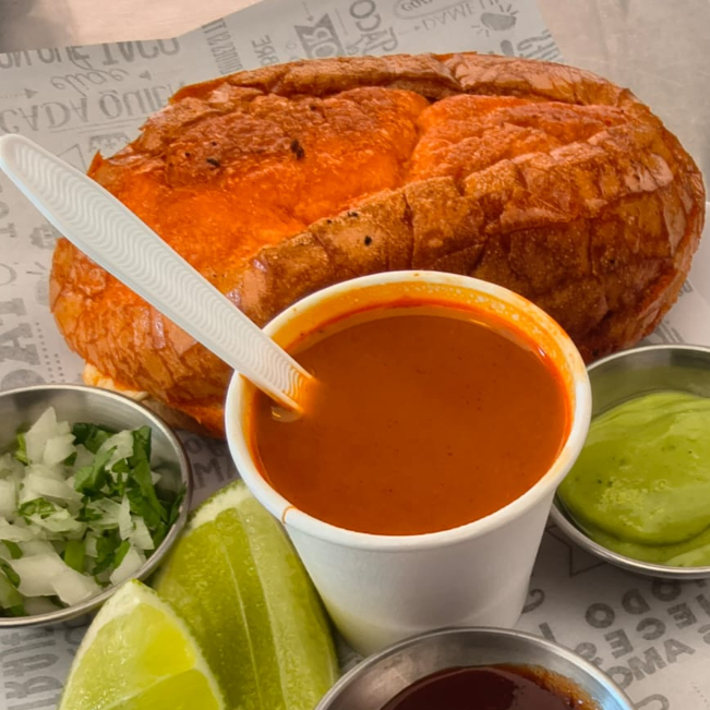 MEDIO LITRO DE CONSOMÉ DE RES ACOMPAÑADO DE CARNE DE BIRRIA