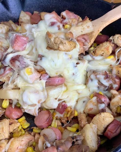 Jamón, tocino, salchicha, queso amarillo y quesillo.