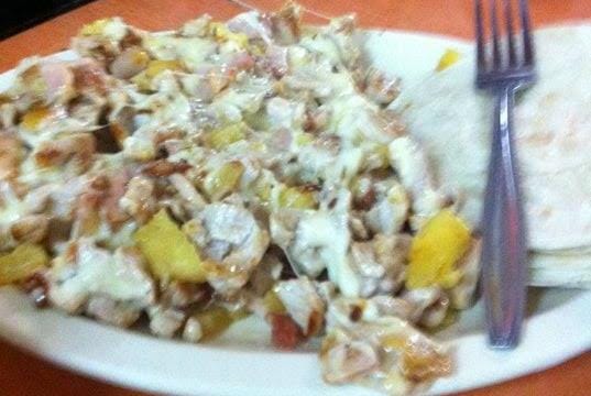 Morrón, cebolla, carne al pastor, piña y quesillo.